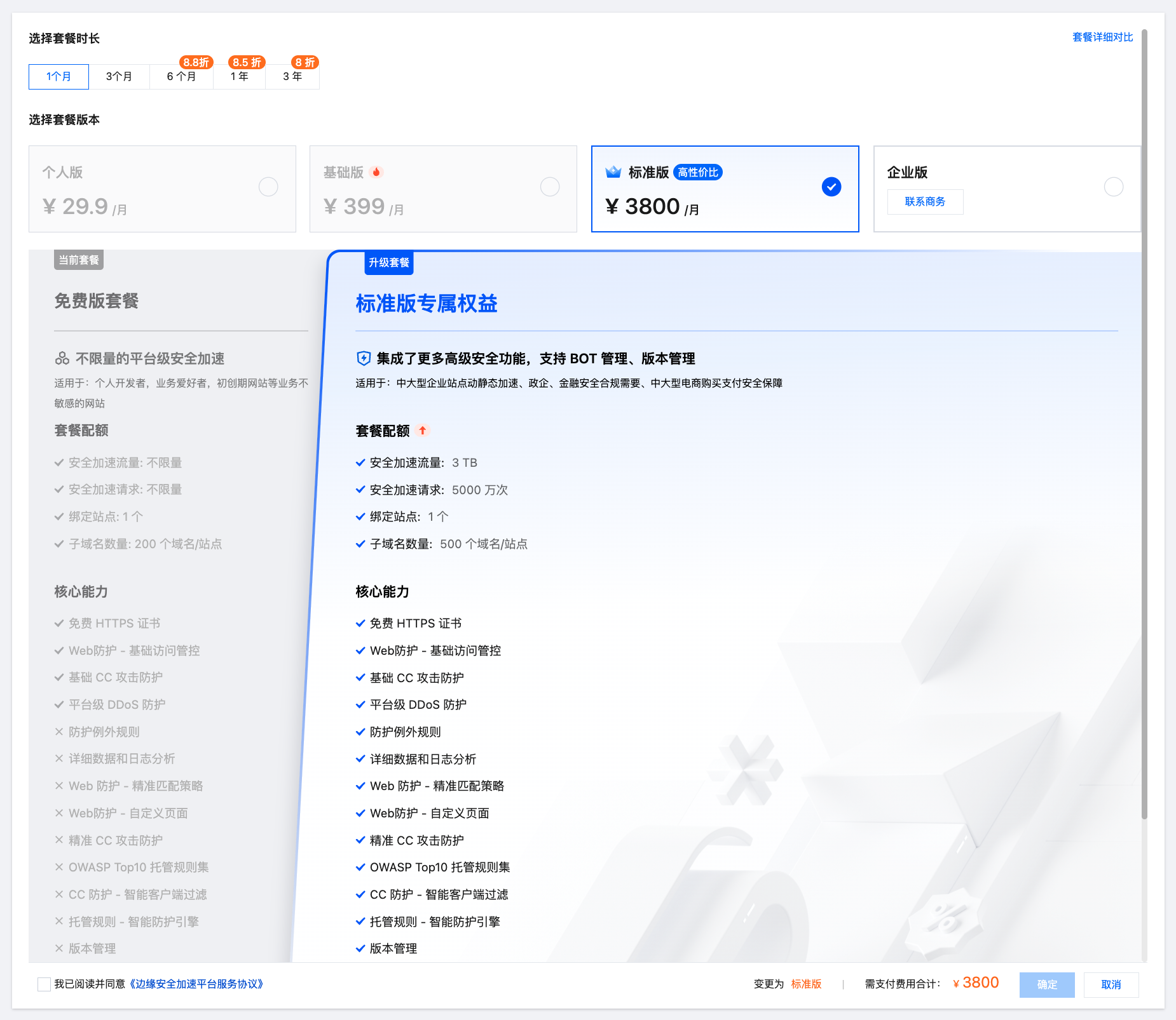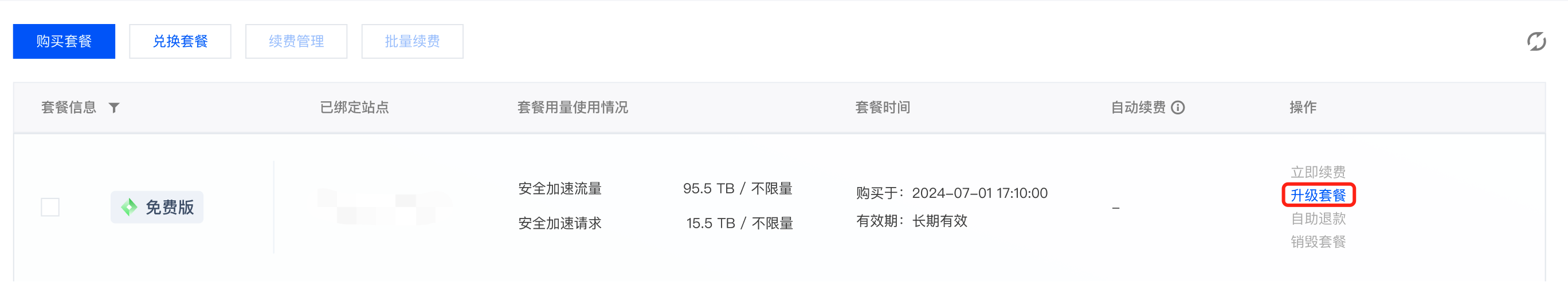 套餐用量 | 安全加速流量:不限量 安全加速请求:不限量 |