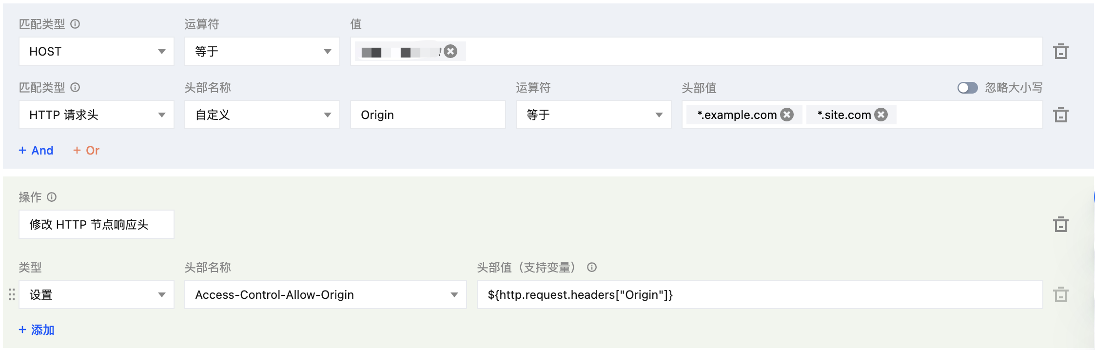 Access-Control-Allow-Origin 头部的前提条件为客户端请求携带 Origin 头部,且该头部与设置的 Access-Control-Allow-Origin 任意一个值精确匹配。Vary: Origin 头部,且在 EdgeOne 上开启 Vary 特性。www.example.com 的资源仅允许来自 example.com 、site.com 的页面访问加速域名,可参考以下步骤。www.example.com,*.example.com、*.site.com。Access-Control-Allow-Origin,头部值设置为 ${http.request.headers["Origin"]}。