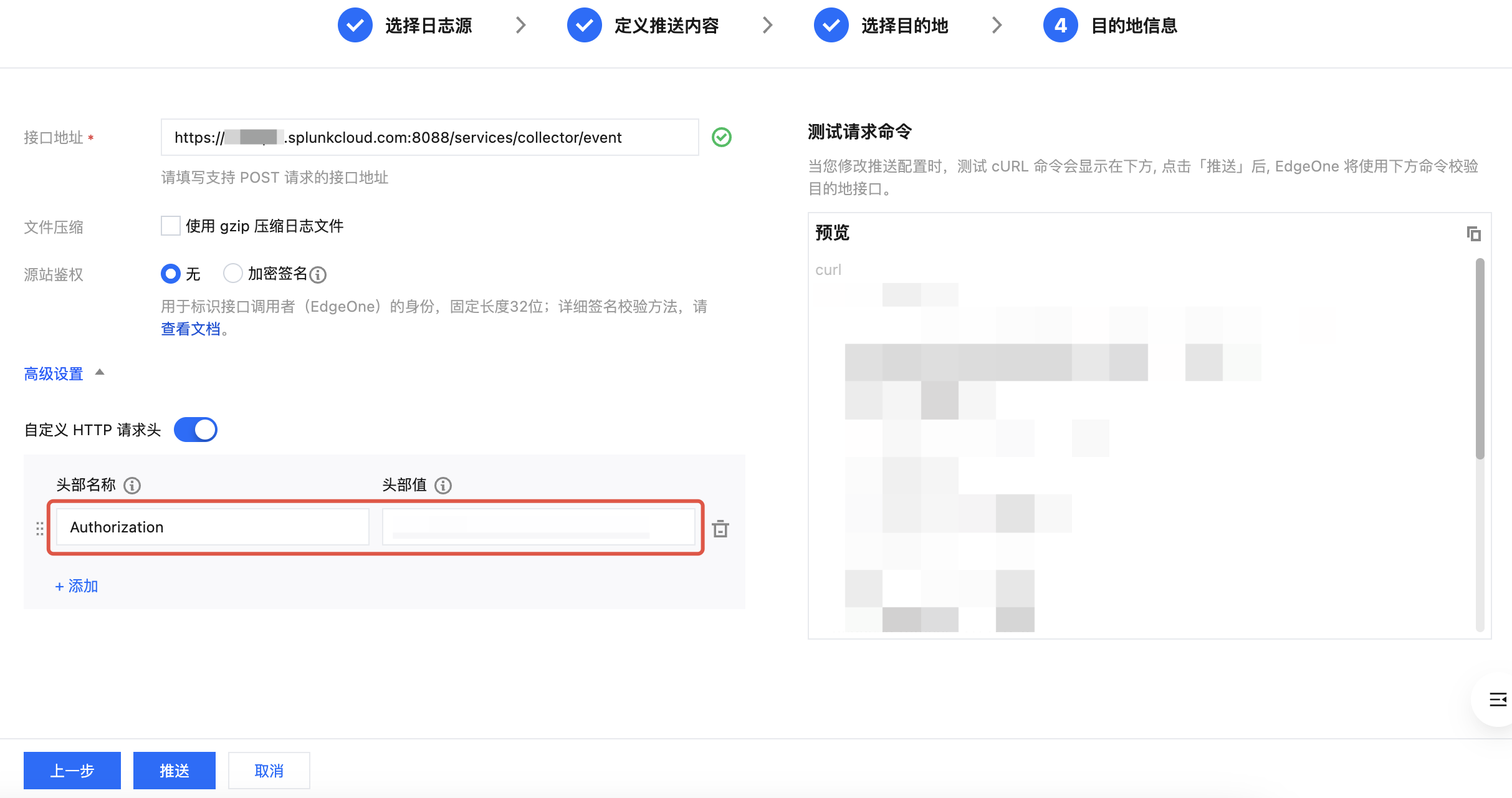 参考 推送至 HTTP 服务器 在 EdgeOne 内配置实时日志推送任务,以下为推送 Splunk 的目的地信息配置说明: