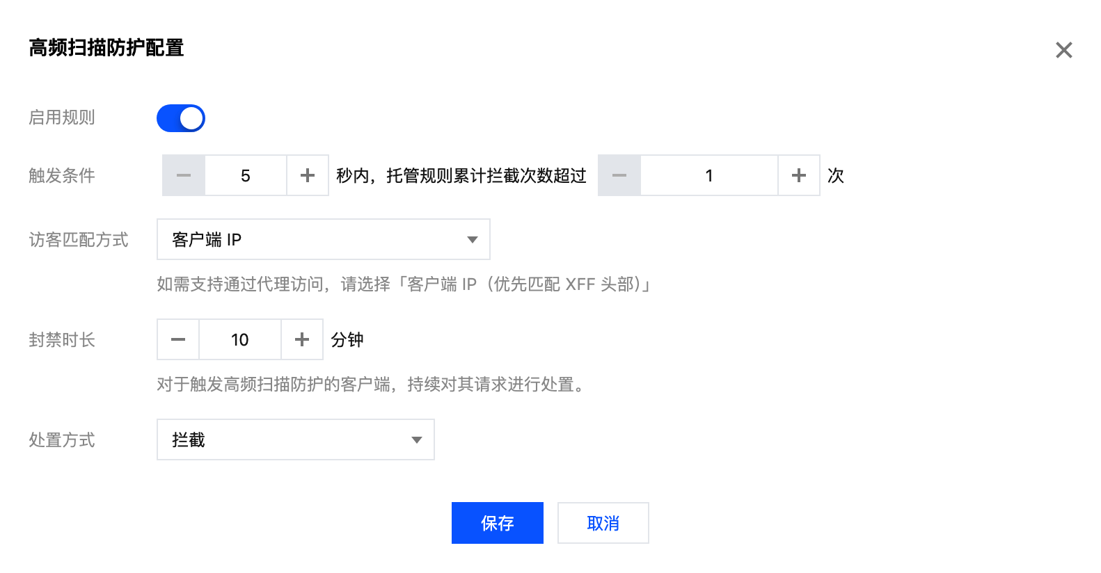 处置方式:处置方式决定了对触发高频扫描防护的访客采取的具体行动,支持以下三种: 观察:仅记录日志,不对请求进行实际处置。适用于策略测试和效果评估阶段。