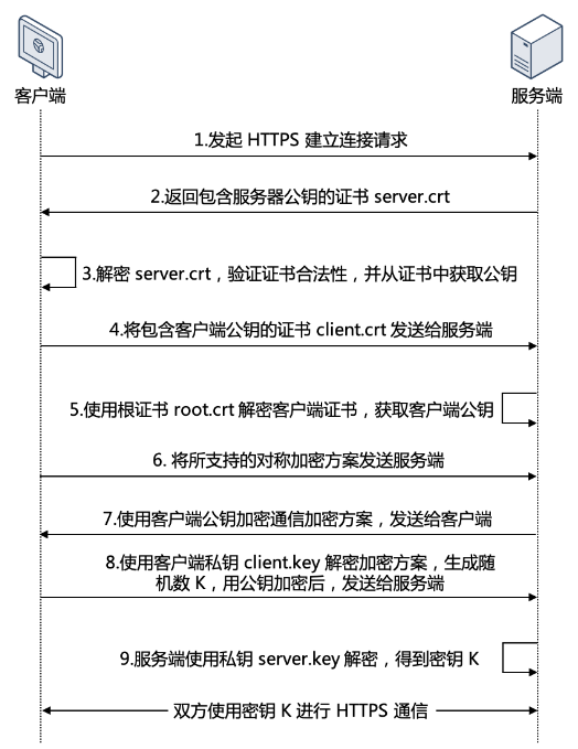 9. 服务端收到客户端发送的加密信息后,使用服务端的私钥(server.key)进行解密,获取对称加密密钥(密钥 K)。在接下来的会话中,客户端和服务端将会使用该对称加密密钥(密钥 K)进行通信,保证通信过程中信息的安全。