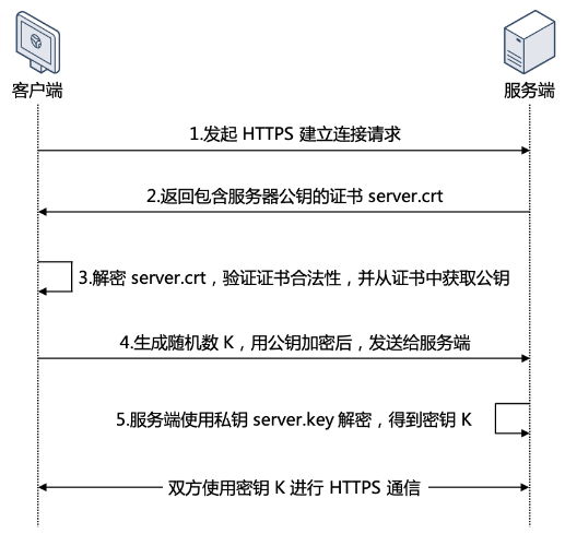 5. 服务端收到客户端发送的加密信息后,使用私钥(server.key)进行解密,获取对称加密密钥(密钥 K)。在接下来的会话中,客户端和服务端将会使用该对称加密密钥(密钥 K)进行通信,保证通信过程中信息的安全。