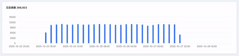 若您想查看柱状趋势图上特定的时间段,如下图所示,可以通过鼠标在曲线上点击滑动选取柱状趋势图的特定区域。该区域所对应的时间范围将会回填至顶部筛选栏,并影响日志详情。