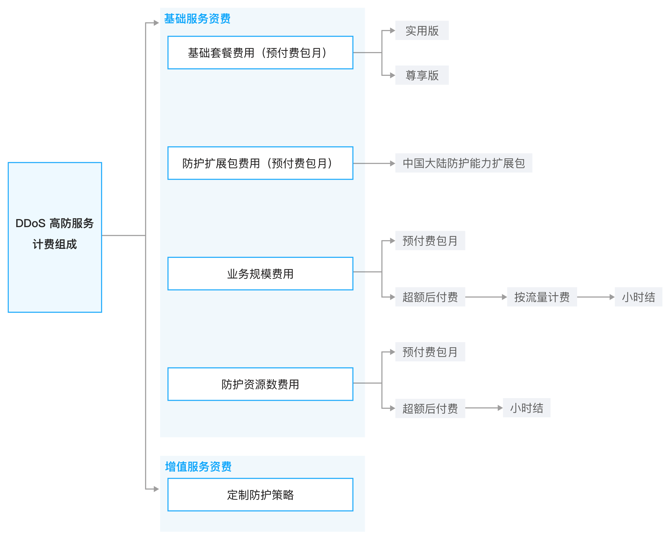 DDoS 高防服务提供两个基础套餐版本,用户可根据业务情况和攻击风险选择其一订阅: