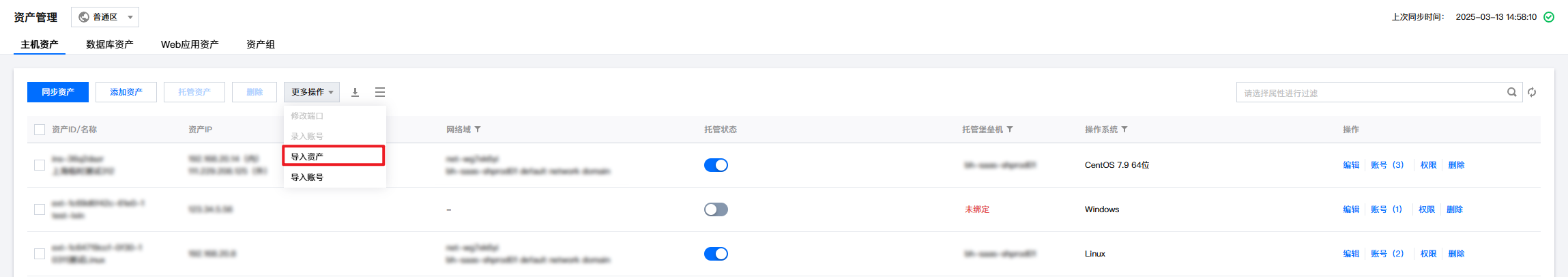 3. 在主机资产页面,单击更多操作 > 导入资产。