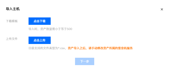 6. 在导入主机窗口中,单击点击上传把主机模板信息上传到堡垒机,并单击下一步。