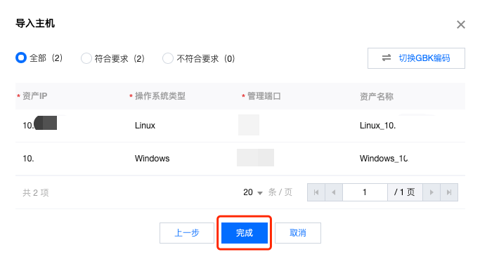 7. 对主机信息进行确认,如果有不符合要求的主机,请修改主机信息使其符合要求;确认主机信息都正确后,单击完成,即可导入主机。