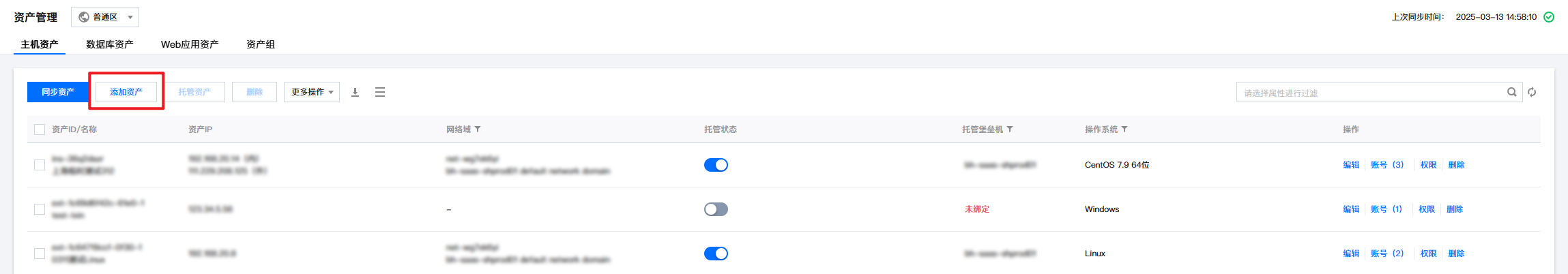 3. 在主机资产页面,单击添加资产。