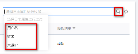 在搜索框中通过日志属性进行筛选,输入用户名、姓名或来源 IP,单击可以快速查询操作日志。 在操作日志页面,可以通过具体操作行为和操作结果来检索特定的操作日志。
