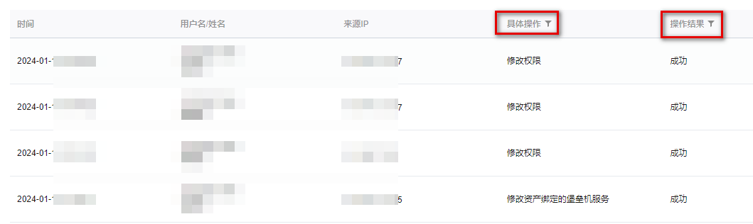 3. 在操作日志页面,详细记录了操作时间、操作用户名/姓名、来源 IP、具体操作及操作结果。