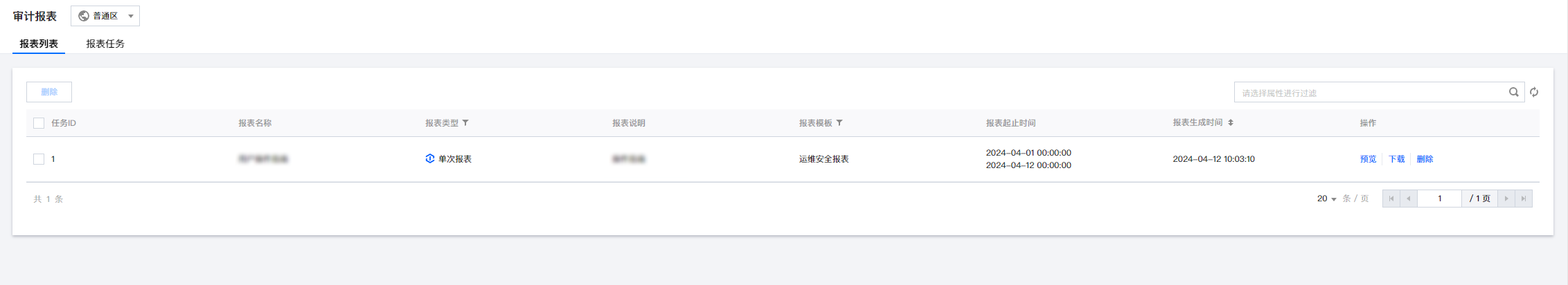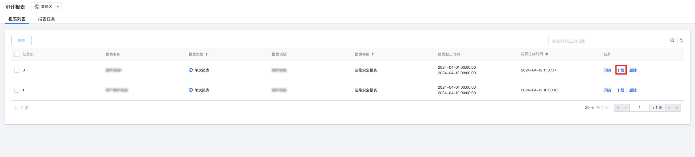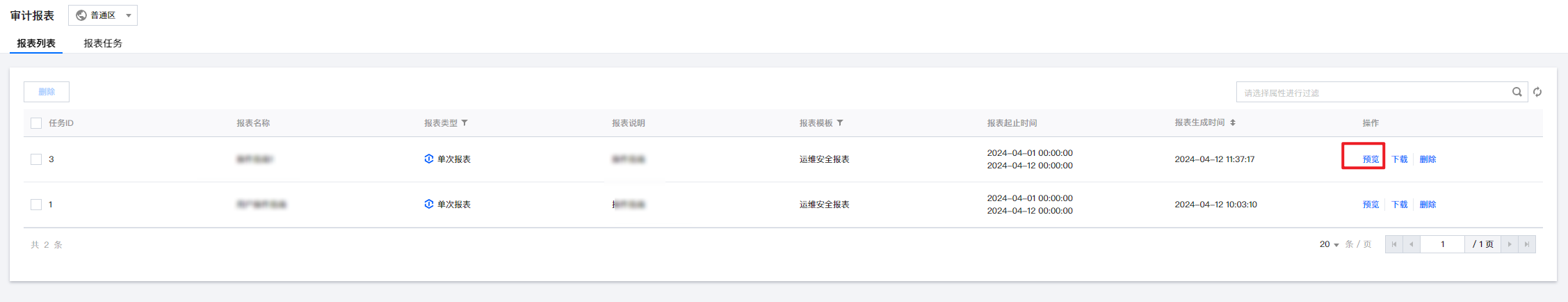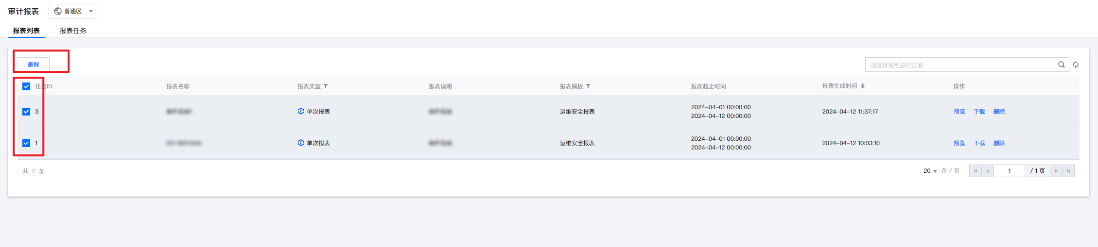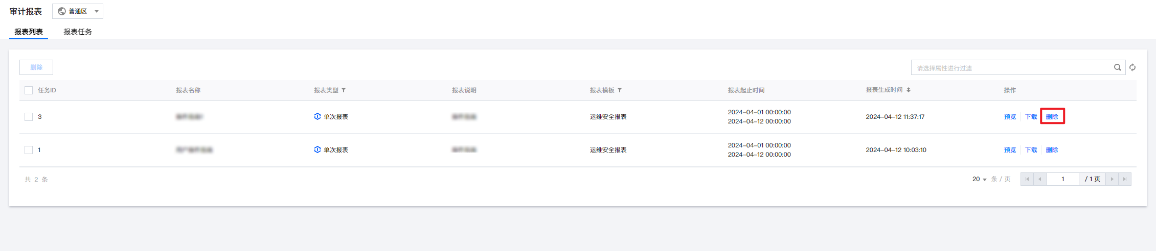 1. 在审计报表 > 报表列表页面,可删除单个报表或多个报表。