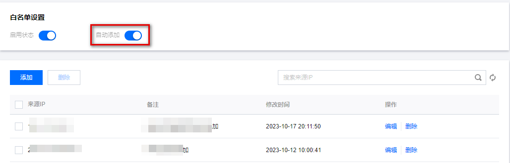 默认情况下会关闭访问白名单功能(放行任意来源 IP),可单击单击图标将功能开启,开启后才可以进行以下操作。 3. 默认情况下,自动添加白名单功能为开启状态,此时运维用户登录成功之后,将自动把运维用户的来源 IP 加到访问白名单;该功能用户可手动关闭。