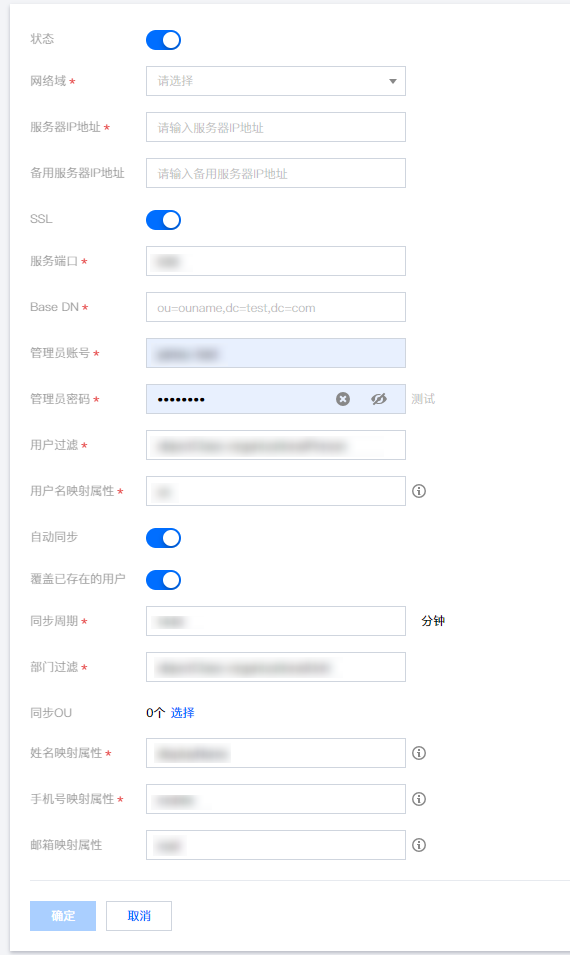 Base DN | 输入 LDAP 服务器的 Base DN 信息,格式为:ou=ouname,dc=test,dc=com。 |