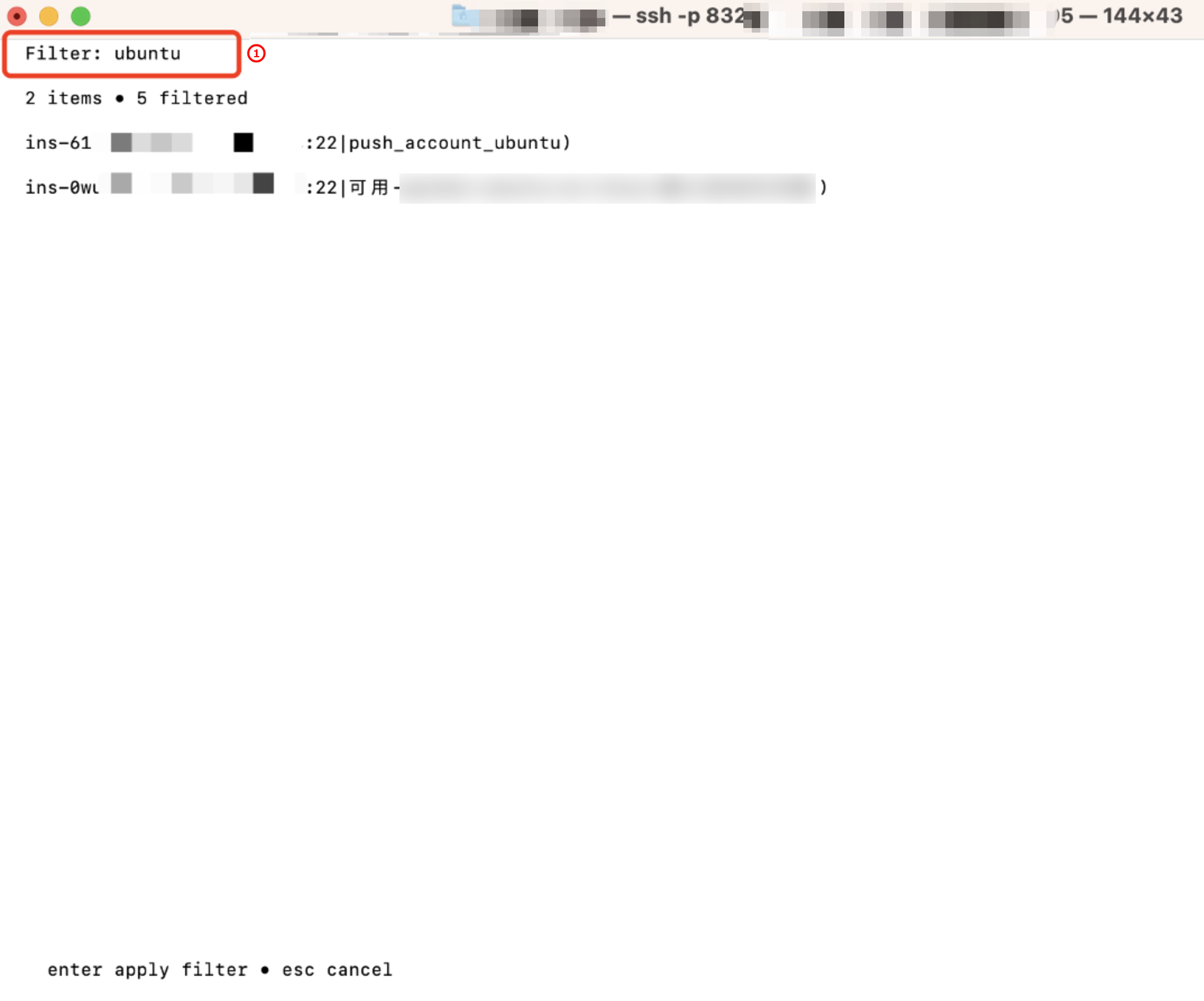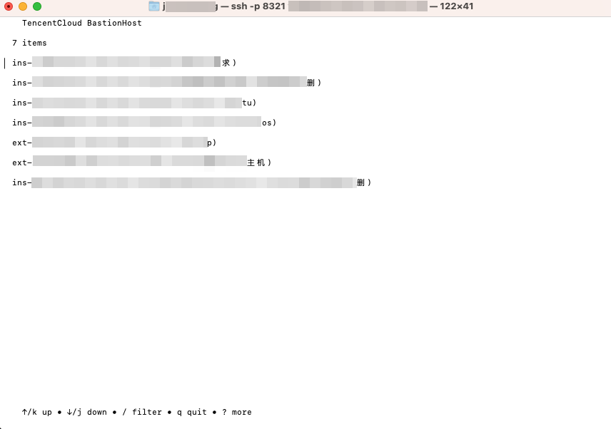 ↑/k键可以向上选择资产,按下↓/j键可向下选择资产。如果资产数量较多,会翻页展示全部资产,可通过向下选择找到需要运维资产信息。