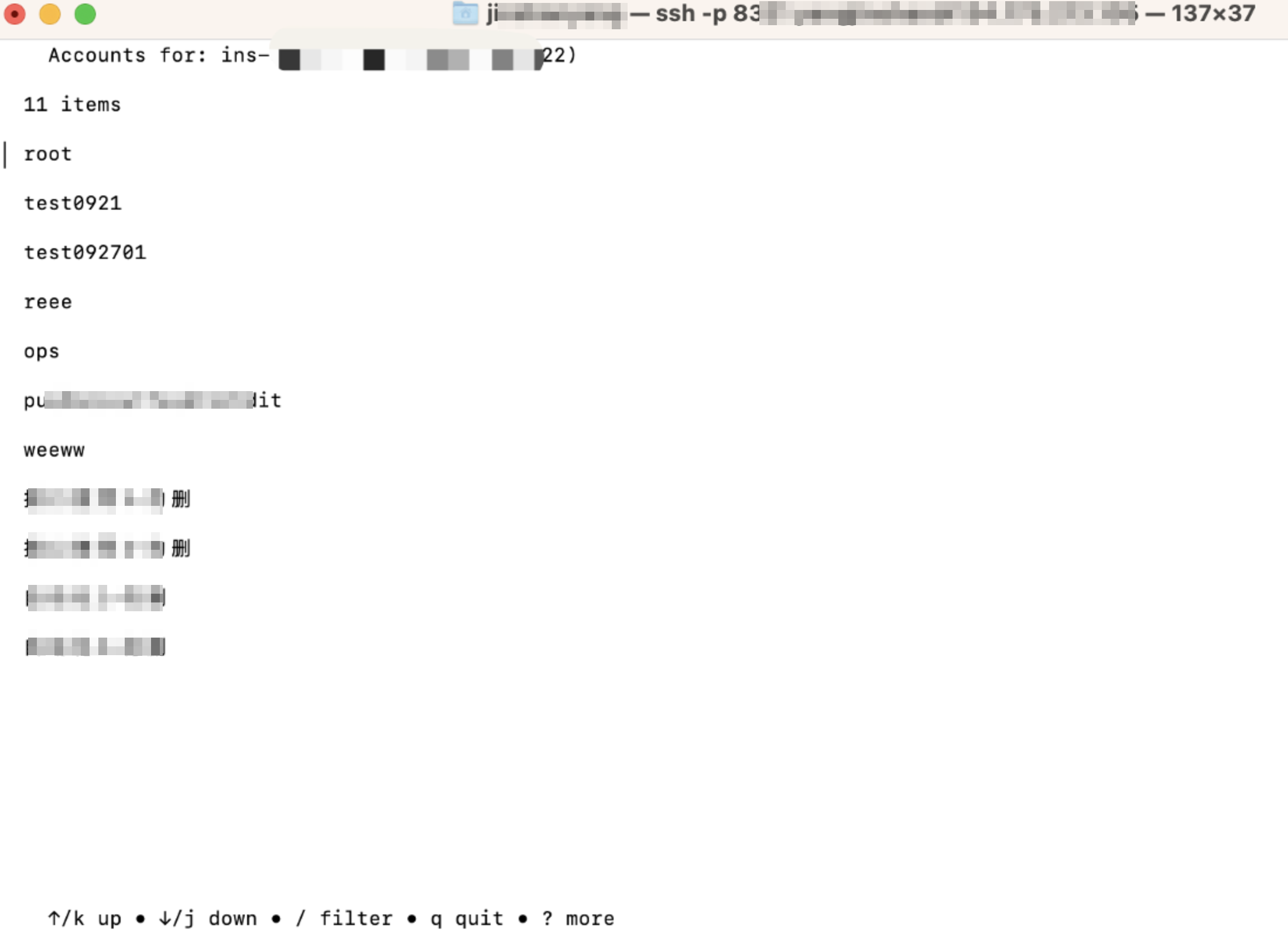enter键进入账号选择步骤。界面会展示授权给用户的所有资产账号,可上(↑/k)下(↓/j)选择账号,选择好按下enter键登录。