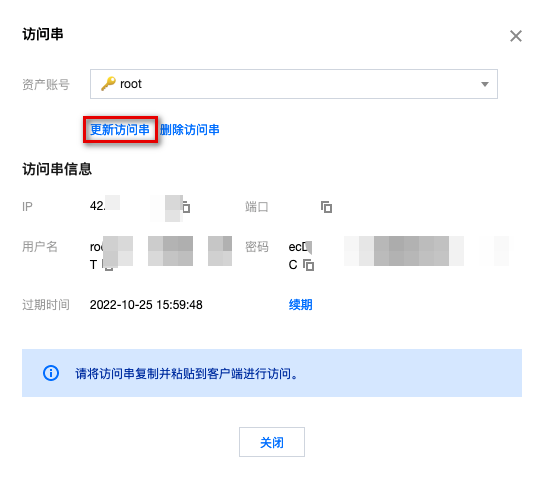 如果访问串未创建,请先单击更新访问串。