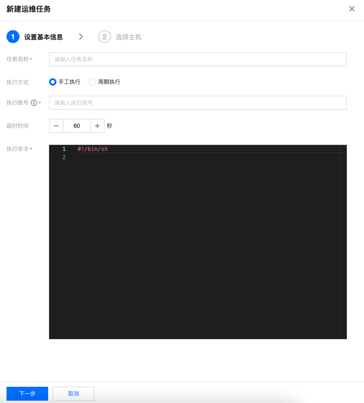 执行账号 | 设置执行运维任务的主机账号信息,需确保执行账号已被授权访问权限,并且执行账号已设置托管密码/密钥。 |