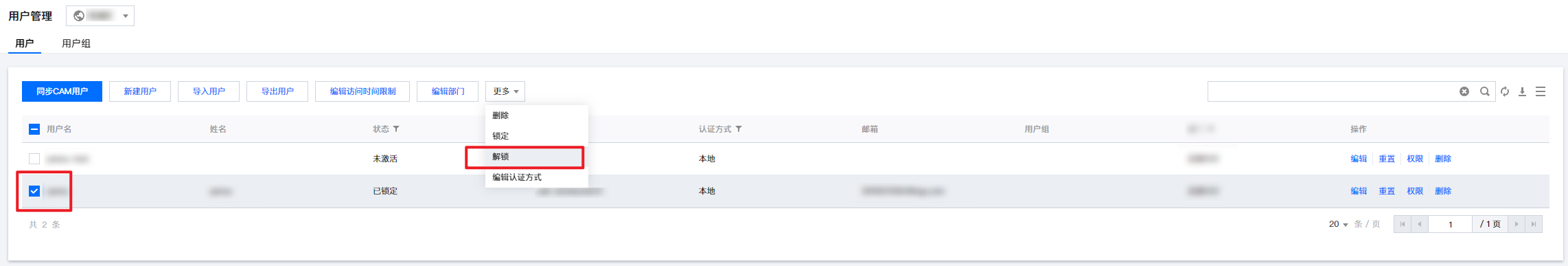 3. 在用户页面,选择目标用户,单击更多 > 解锁。