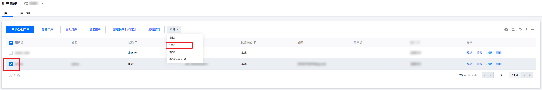 3. 在用户页面,选择目标用户,单击更多 > 锁定。