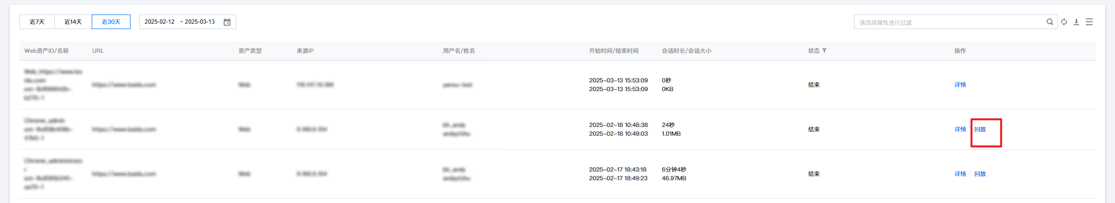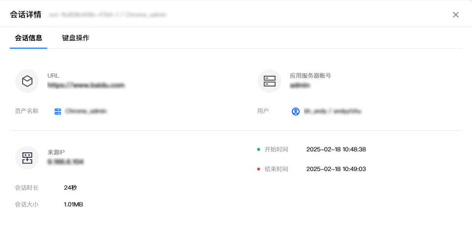 5. 在会话详情页面,可查看会话的基本会话信息、键盘操作记录。 6. 在 Web 应用会话页面,单击对应会话右侧的回放,可在新的页面回放历史会话,还原用户真实操作行为。