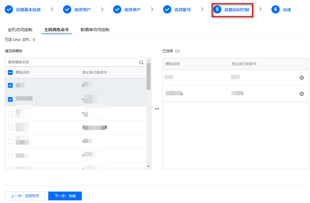 4. 在编辑访问权限页面,跳转到第5步,设置访问权限的主机高危命令。