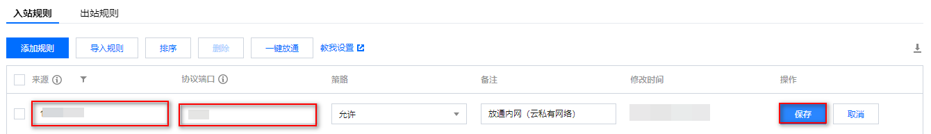 修改:单击编辑,修改来源 IP 和协议端口,单击保存。