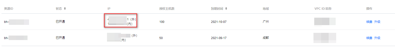 3. 在开通服务页面,查看无法访问目标资源的堡垒机的内外网 IP,并记录内网 IP,用于加入到 步骤6 的入站规则中。 5. 在实例页面,单击需要绑定安全组的 CVM 实例 ID/实例名 > 安全组,进入该实例详情的安全组页面。