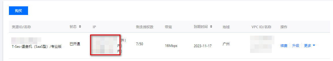 1. 在 开通服务 页面,查看无法访问目标资源的堡垒机的内外网 IP,并记录内网 IP,用于加入到 步骤5 的入站规则中。 3. 在实例页面,单击需要绑定安全组的 CVM 实例 ID/实例名 > 安全组 ,进入该实例详情的安全组页面。