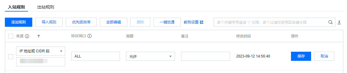 修改:单击编辑,修改来源 IP 和协议端口,单击保存。