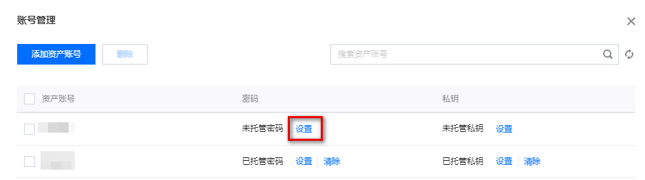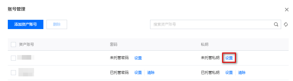 5. 在账号管理弹窗,单击私钥的设置,设置托管私钥。