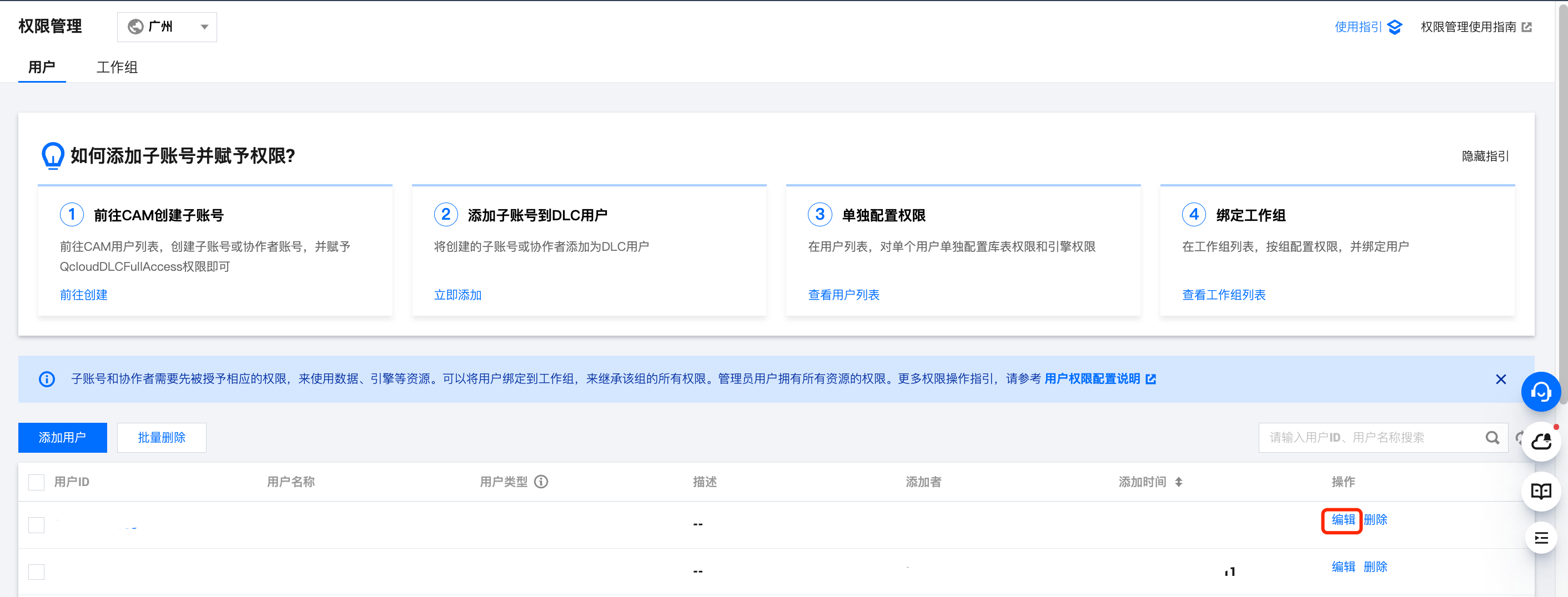在用户列表为用户单独进行授权,授权包含“数据权限”和“引擎权限”,权限策略与工作组涉及权限策略一致。更多详细操作参见 子账号权限管理。 添加工作组