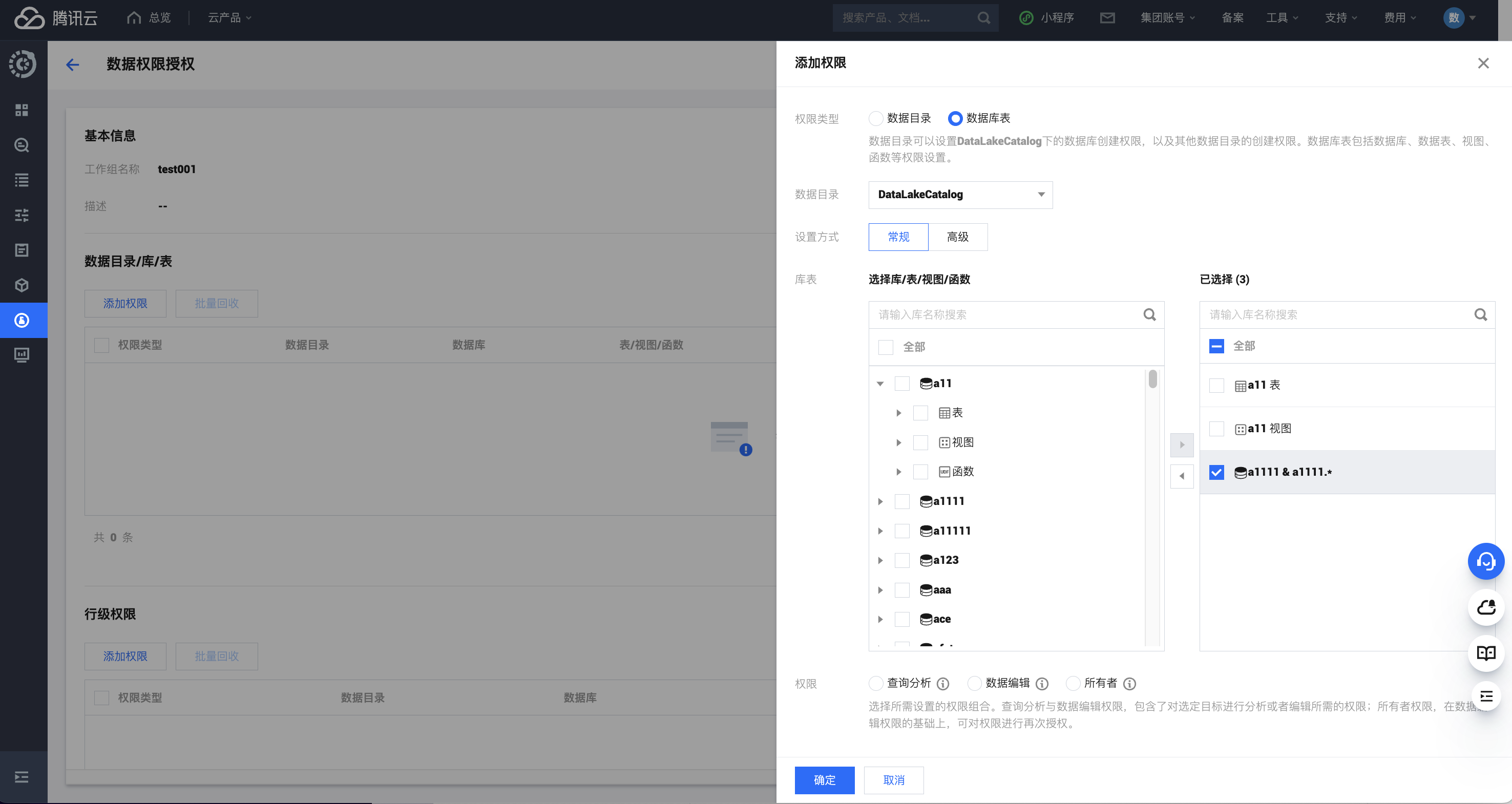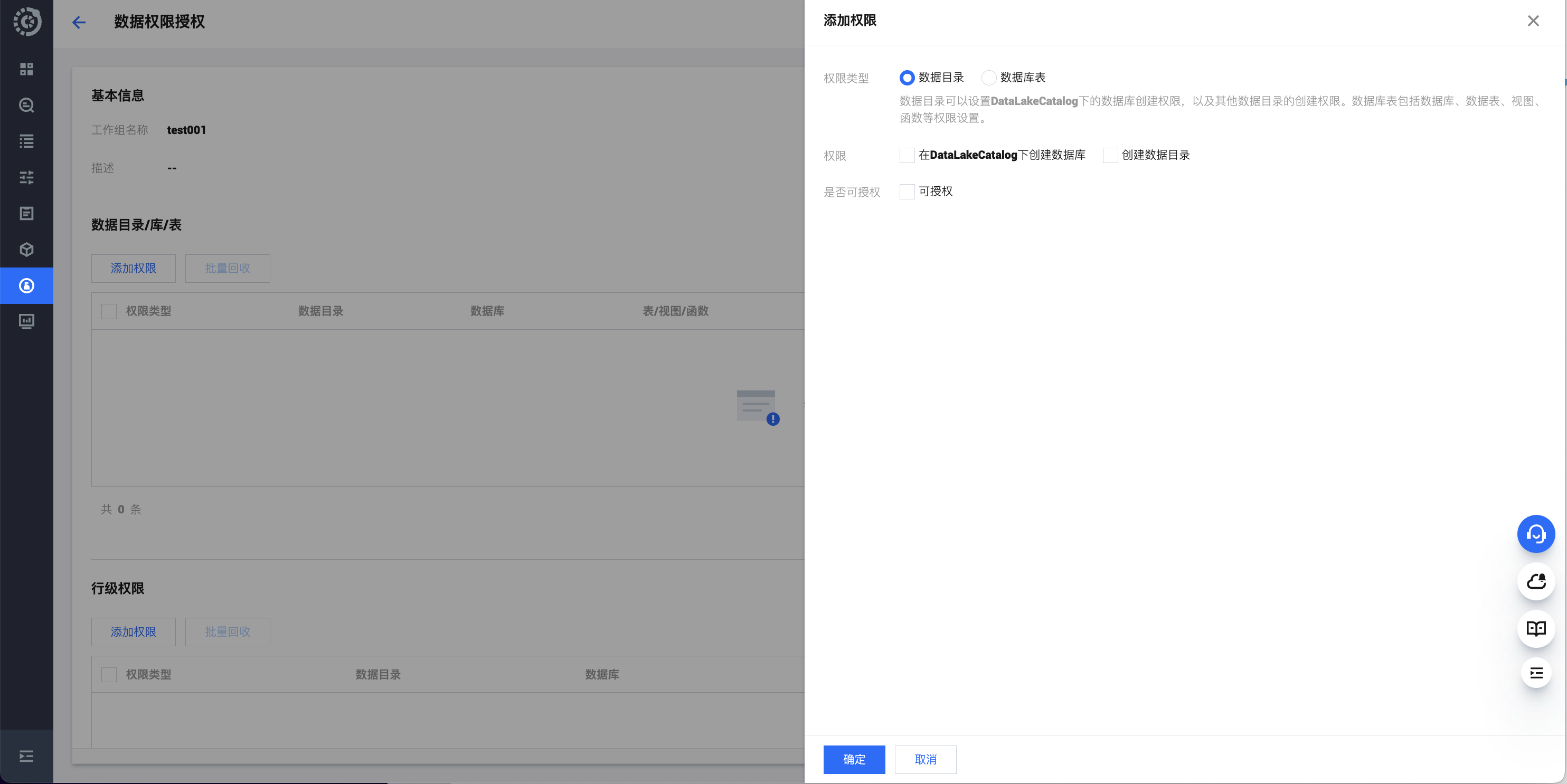 创建工作组后单击列表中的授权操作,为工作组添加权限,包括数据权限和引擎权限。