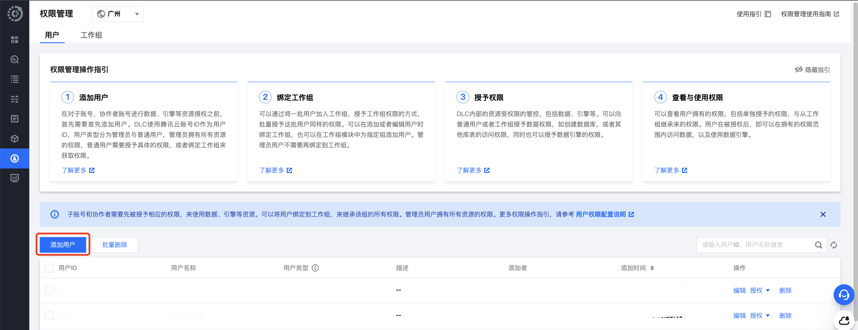 数据湖计算 DLC 使用腾讯云账号 ID 作为用户默认 ID,用户类型分为管理员与普通用户,管理员拥有所有资源的权限,普通用户需要授予具体的权限,或者绑定工作组来获取权限。