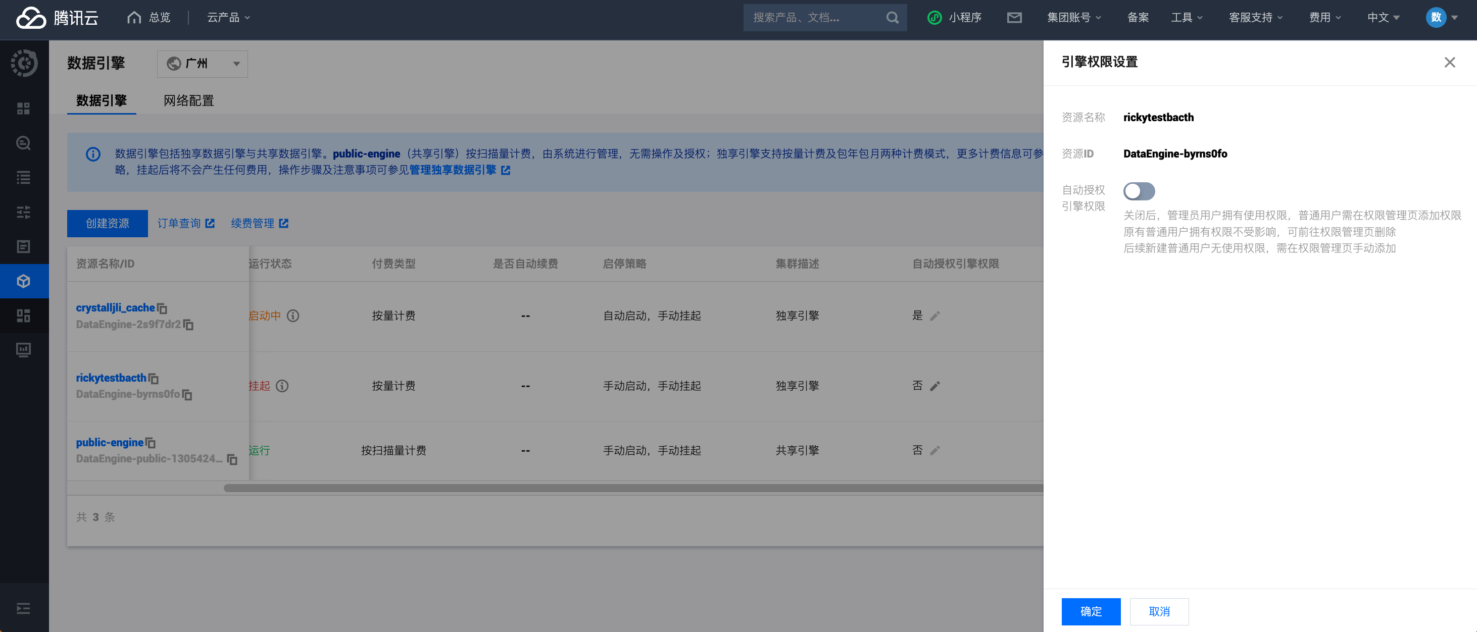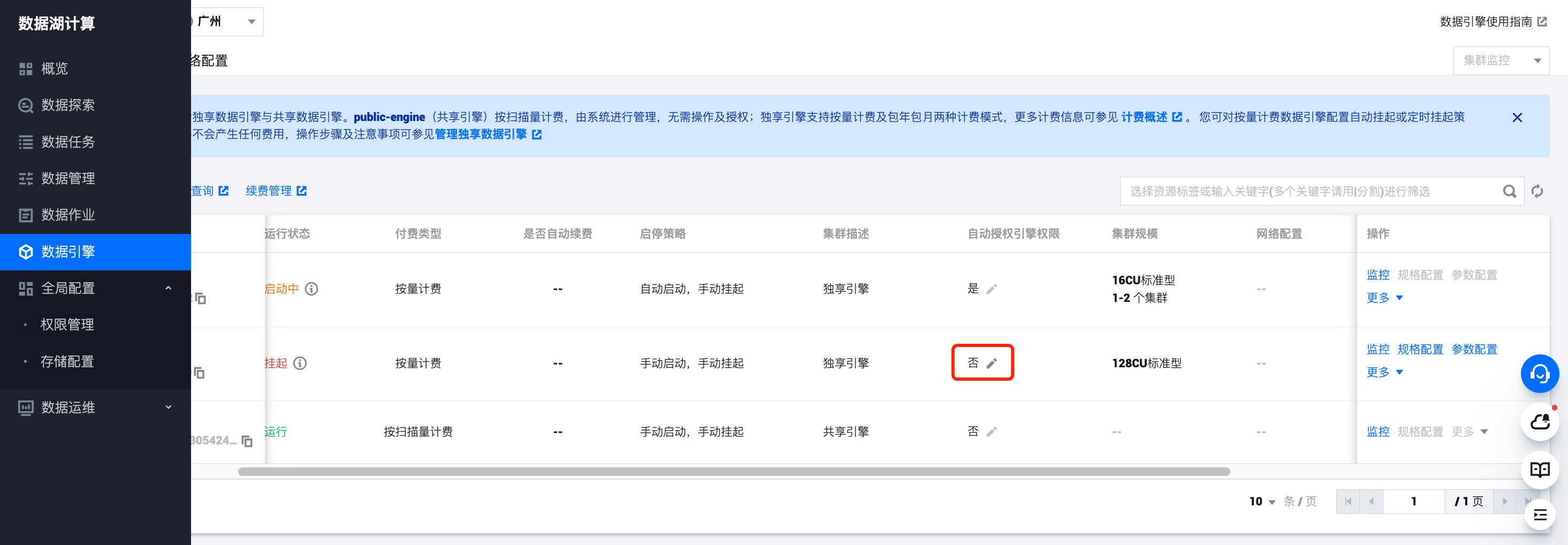 入口二:进入数据引擎 页面,单击编辑授权引擎权限。 引擎权限设置完成后,单击确定。