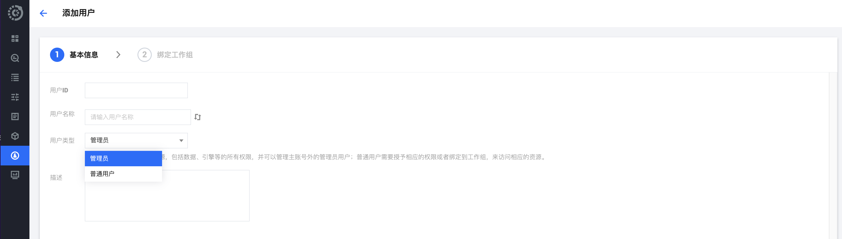 登录 DLC 控制台,选择权限管理,单击用户 > 添加用户,添加新用户。 2. 填写基本信息:填写用户 ID、用户名称和描述,选择用户类型。