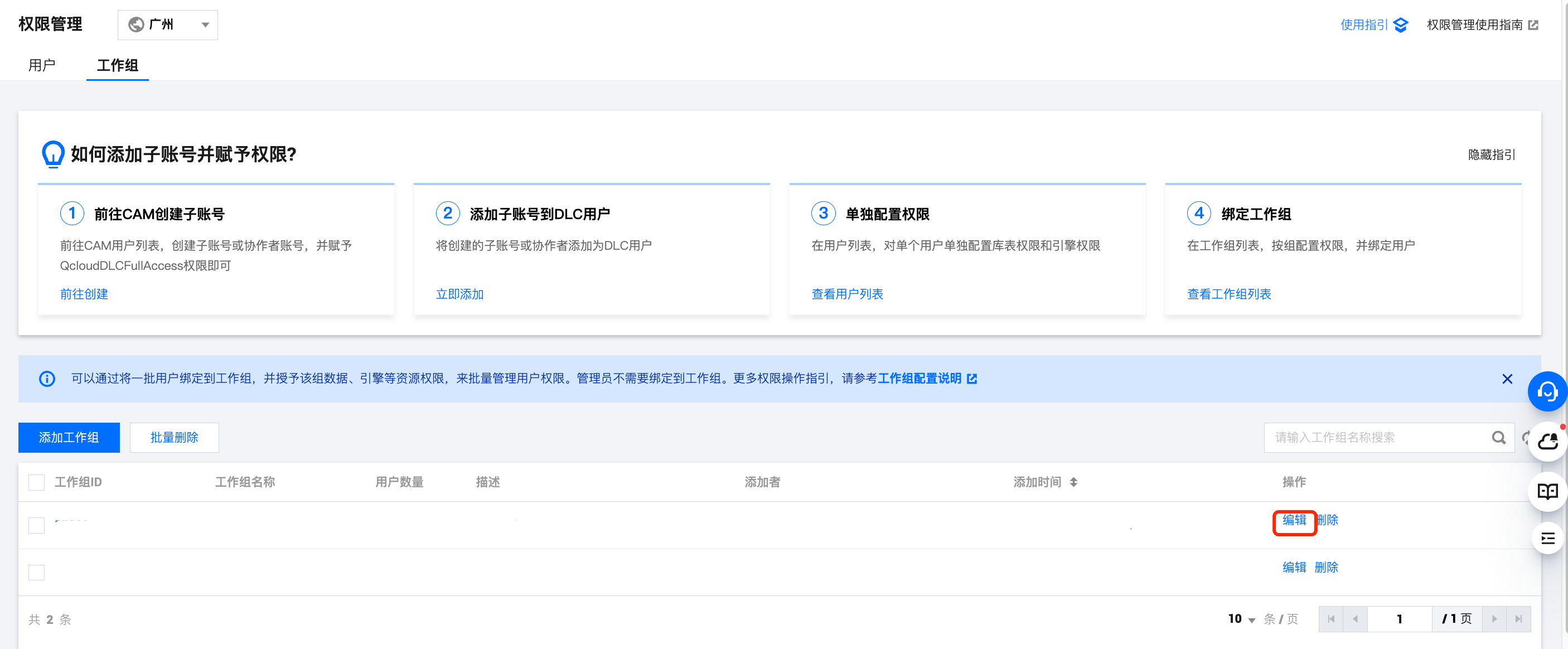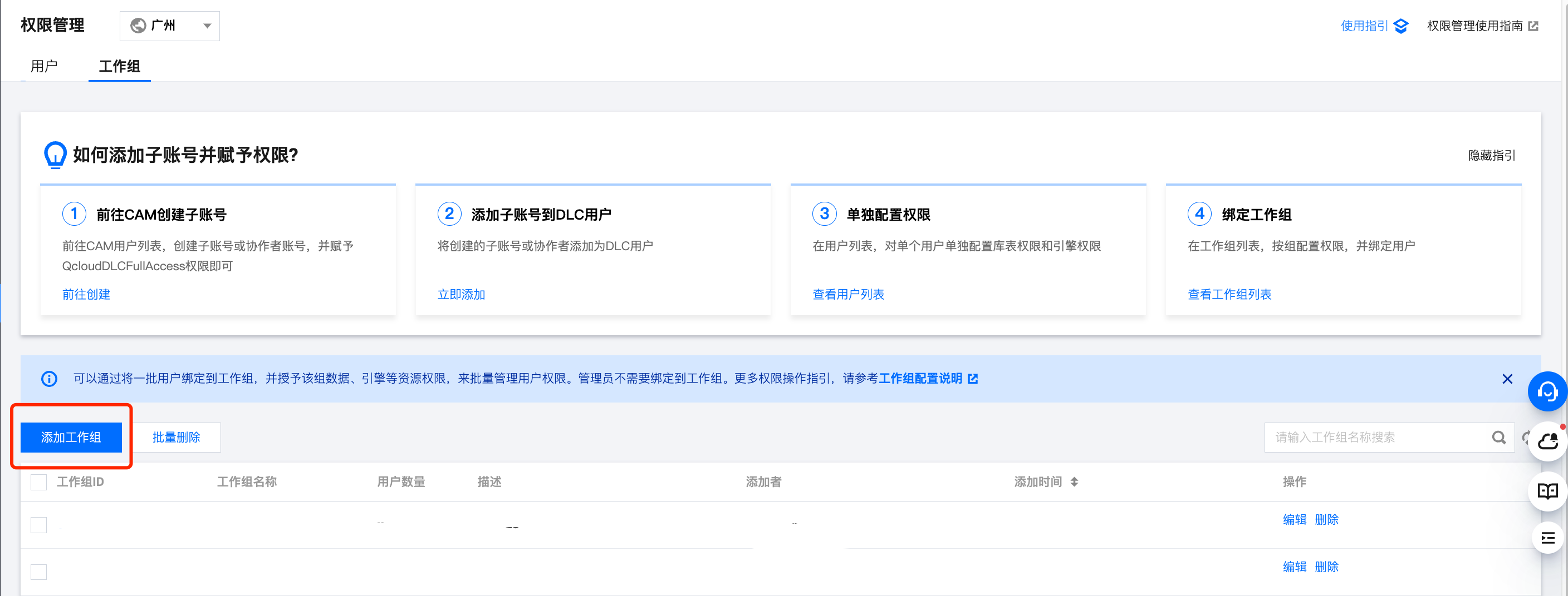 工作组:数据湖计算 DLC 可以将一批用户绑定到工作组,并授予该组数据、引擎等资源权限,来批量管理用户权限,在同一个工作组的用户具有相同的权限。