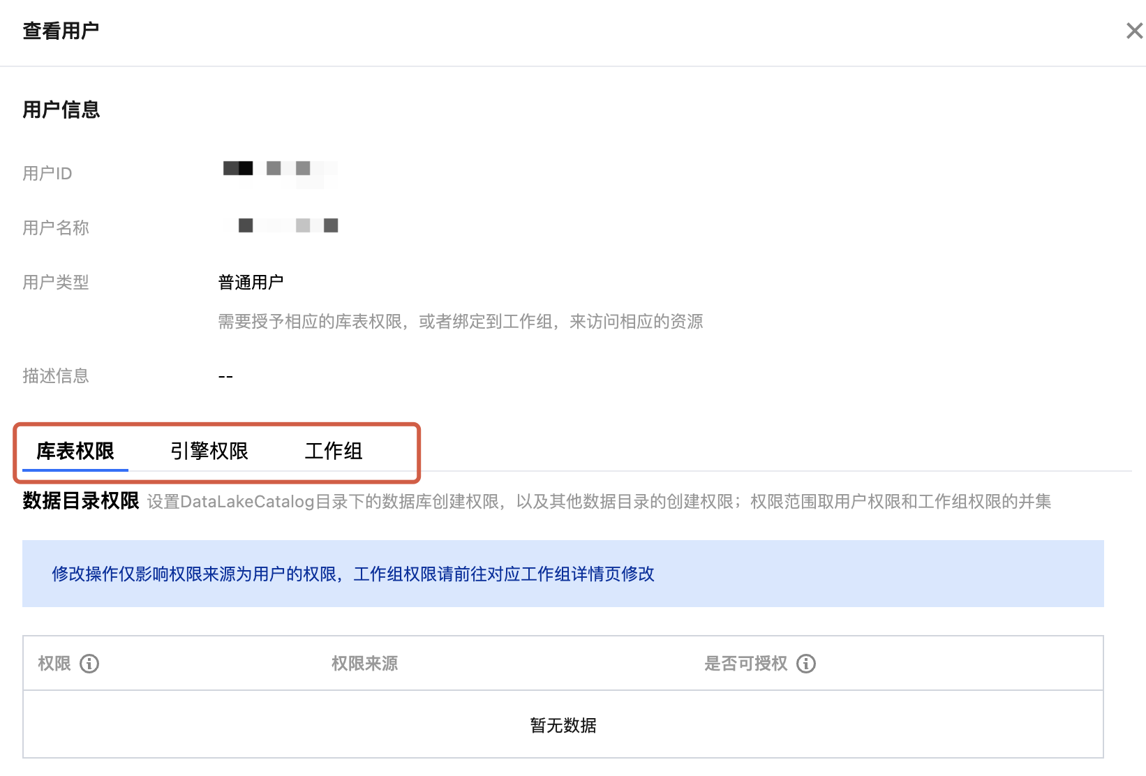 2. 查看用户所在工作组、数据权限、引擎权限等信息。