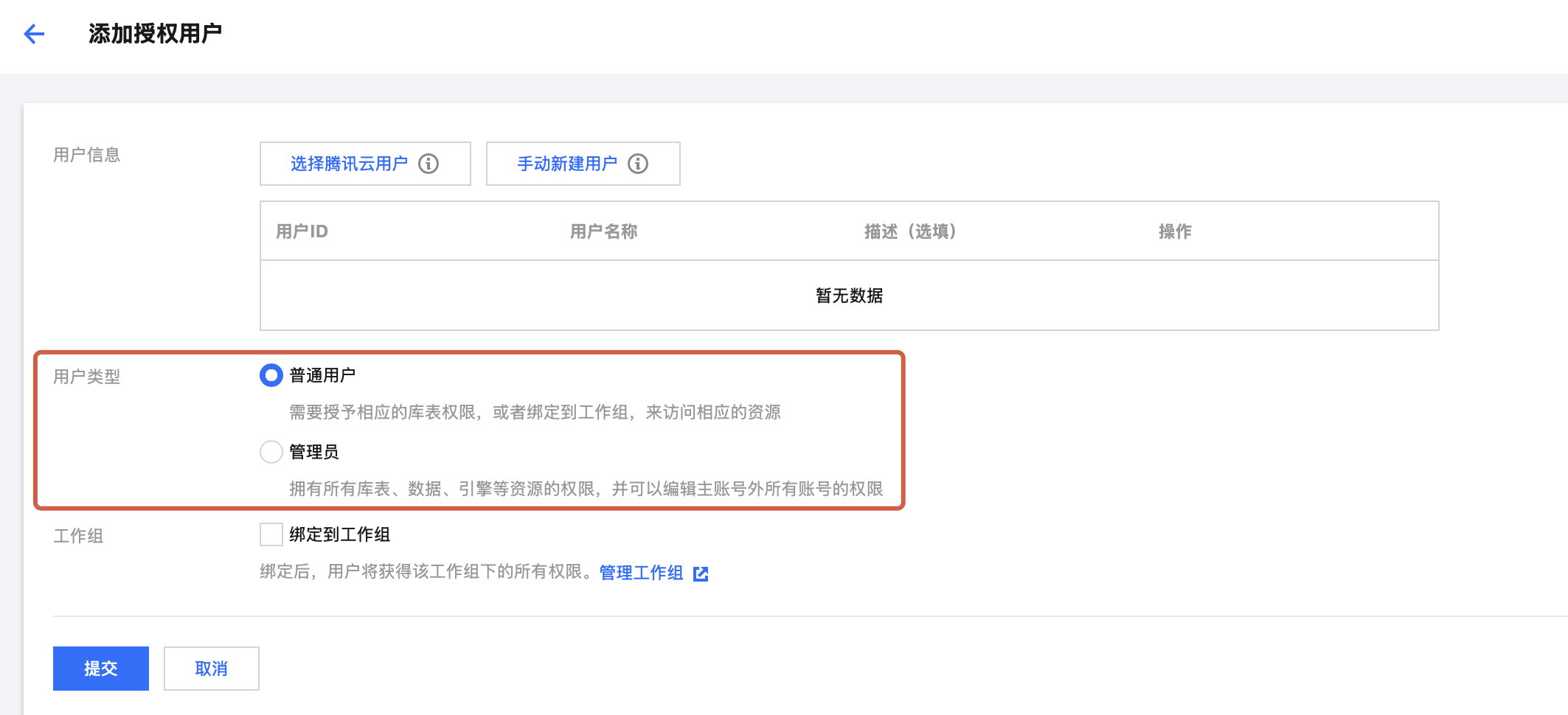 1. 设置用户为管理员/普通用户:操作步骤可看用户和工作组 添加用户部分。管理员类型用户不需要绑定工作组即拥有所有资源,包括数据、引擎等的所有权限,并可以管理主账号外的管理员用户。该权限需要谨慎设置。 2. 绑定工作组:在用户类型下方的工作组选项勾选绑定到工作组,对于普通用户,需要授予相应的权限或者绑定到工作组,来访问相应的资源。