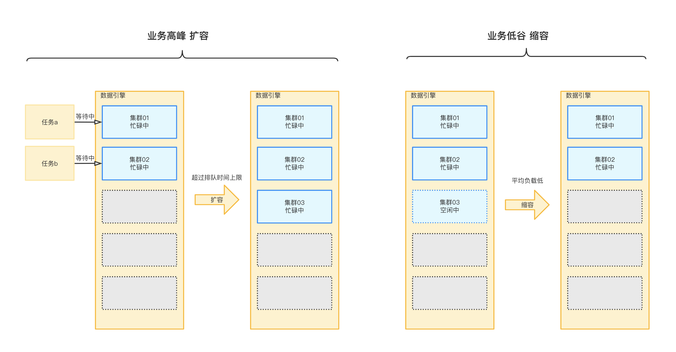 如下图所示:购买时配置了集群数为2个、弹性集群数为3个、任务排队时间上限为5分钟。集群任务高并发时,排队任务超过2个且排队时间超过5分钟,则系统将对数据引擎进行扩容,缓解任务排队情况。扩容成功一段时间后,集群任务排队情况得到缓解,存在集群闲置且负载低,系统将对数据引擎进行缩容。