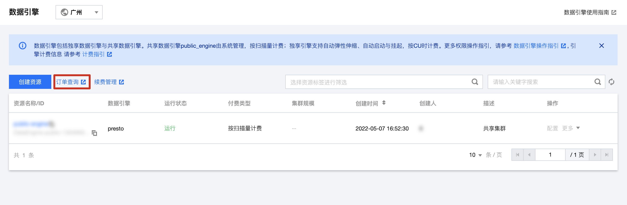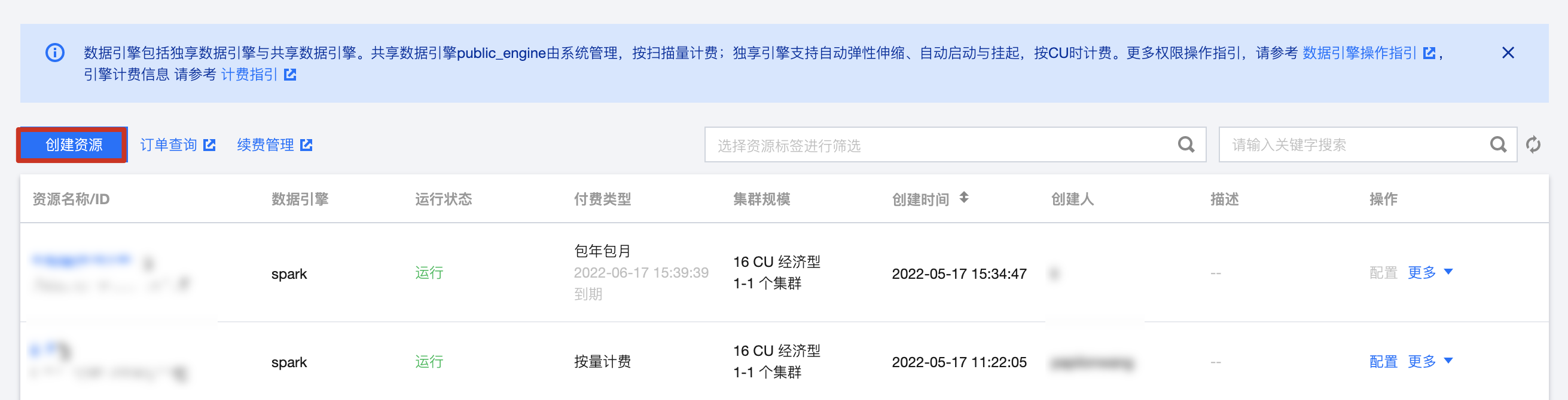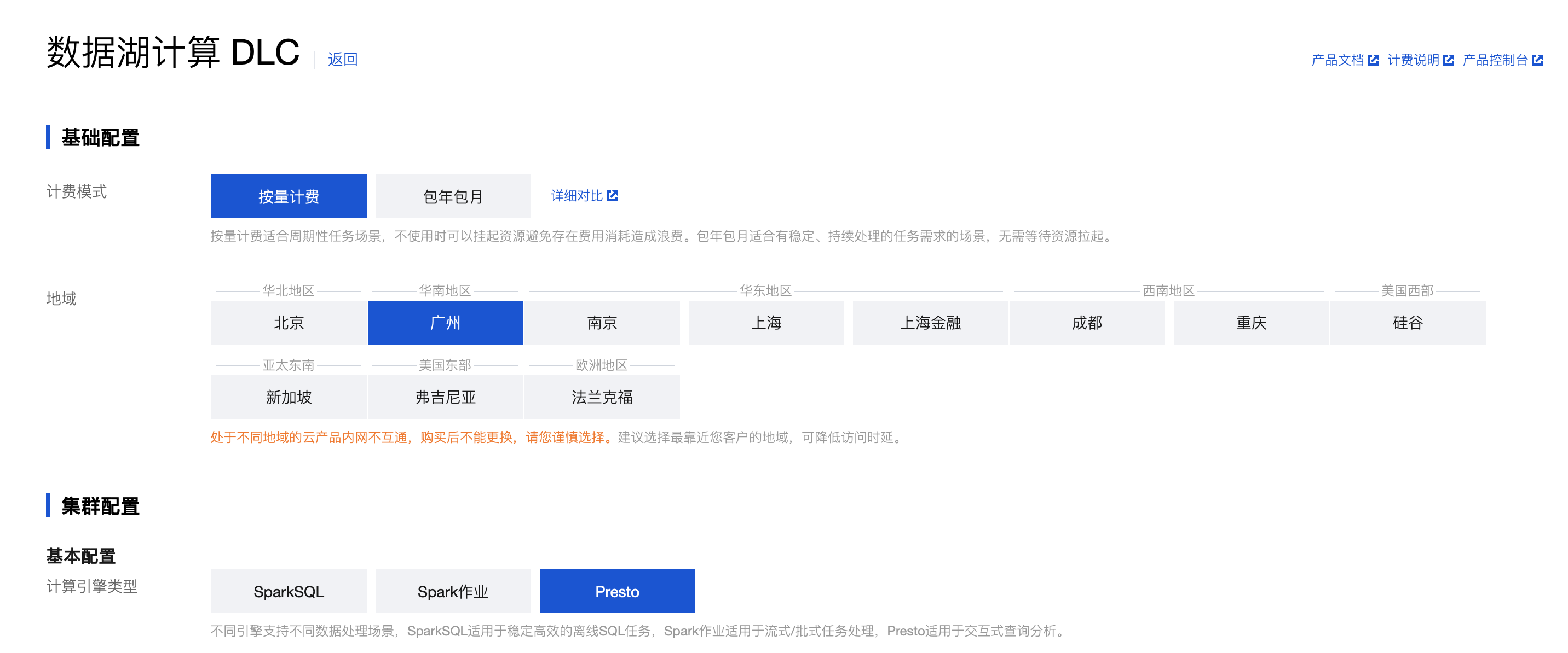 计算引擎:支持 Presto、Spark 两种引擎,购买后不能更换,请谨慎选择。Presto 引擎适用于更快的交互查询分析,且支持多源联合查询。Spark 引擎适用于大数据量的离线任务,任务运行更加稳定。