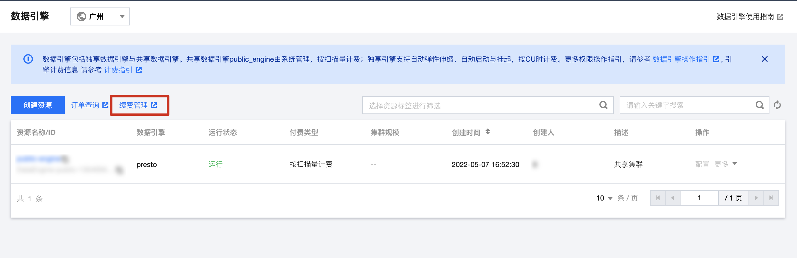 针对包年包月的独享数据引擎,您可通过数据湖计算 DLC 控制台的续费管理入口进入您的资源管理页面进行续费等相关操作,操作步骤如下: