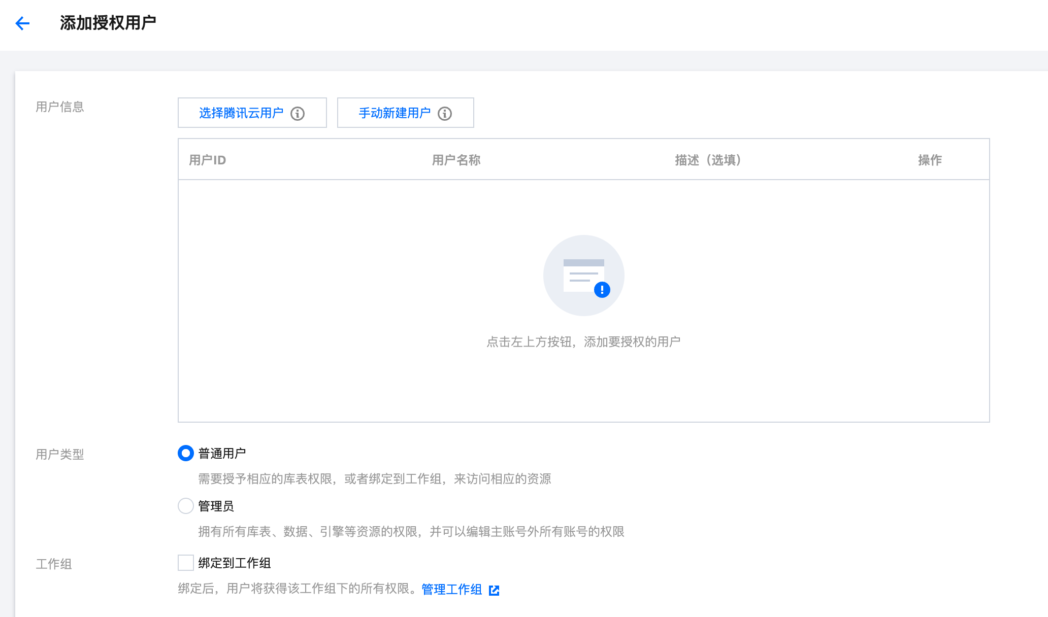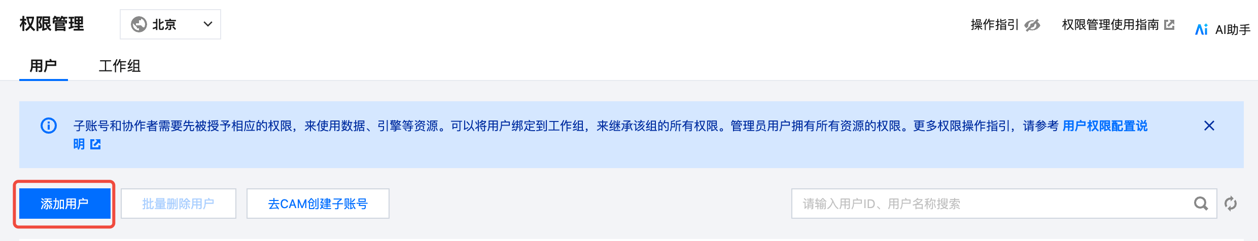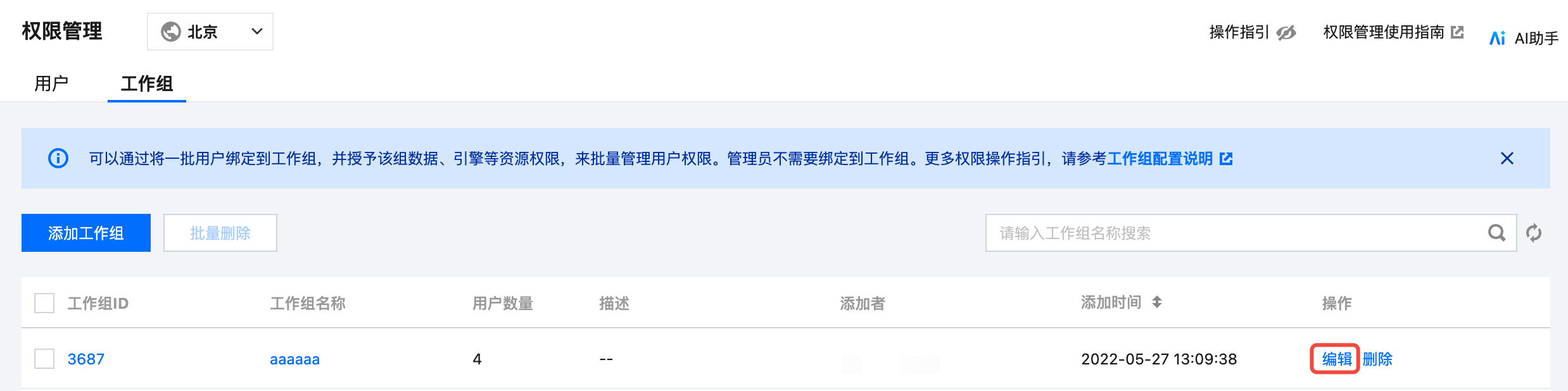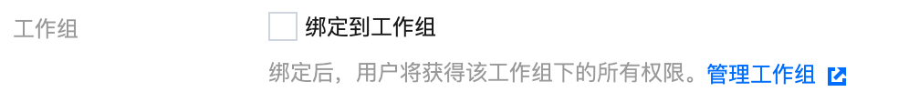 通过权限管理页面,切换至工作组页面,单击创建工作组。 添加用户至工作组