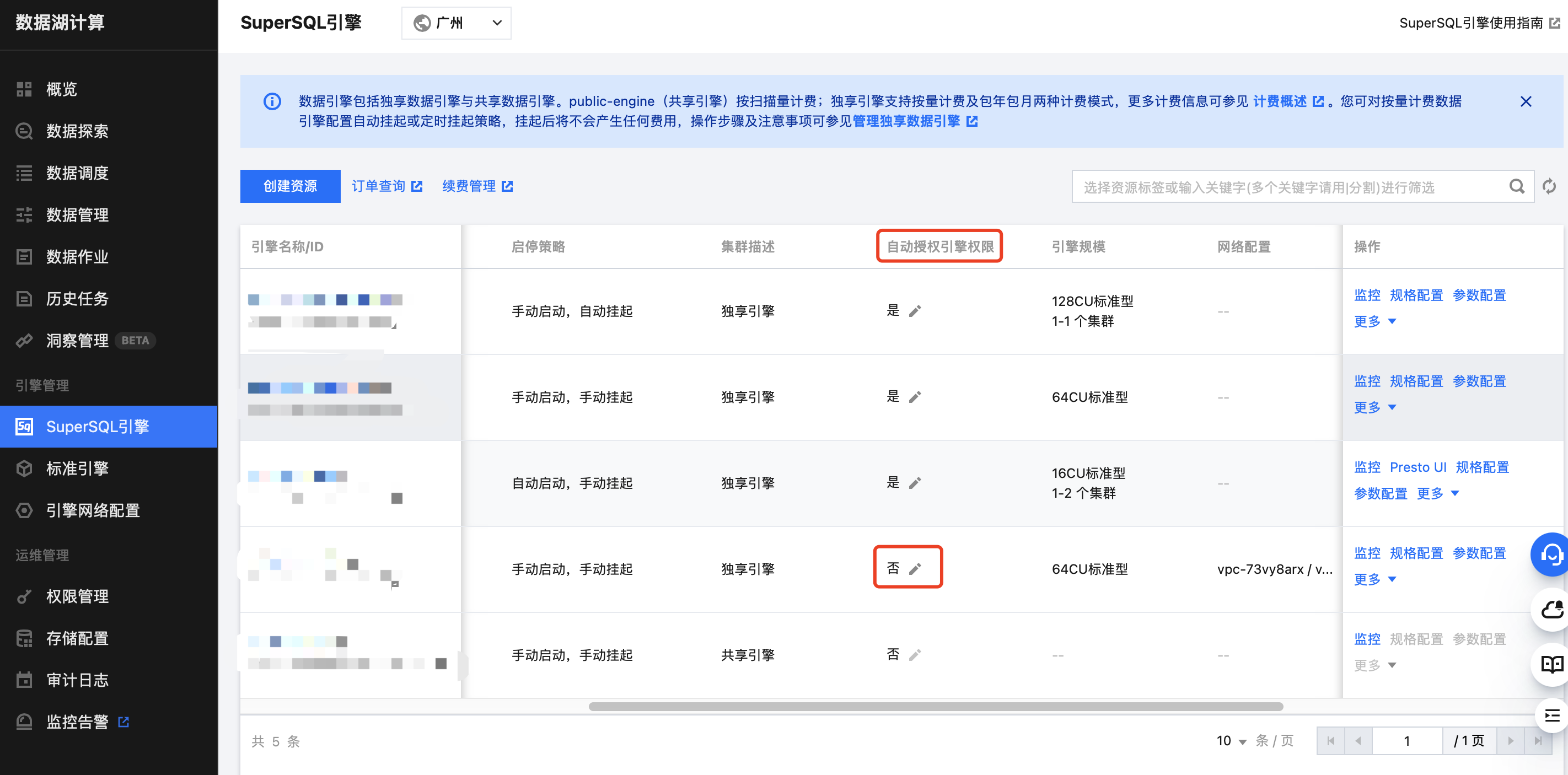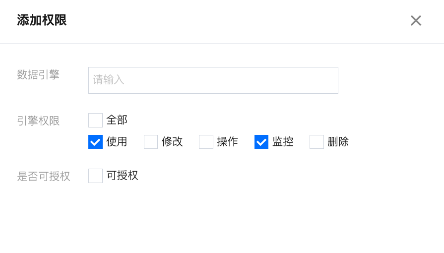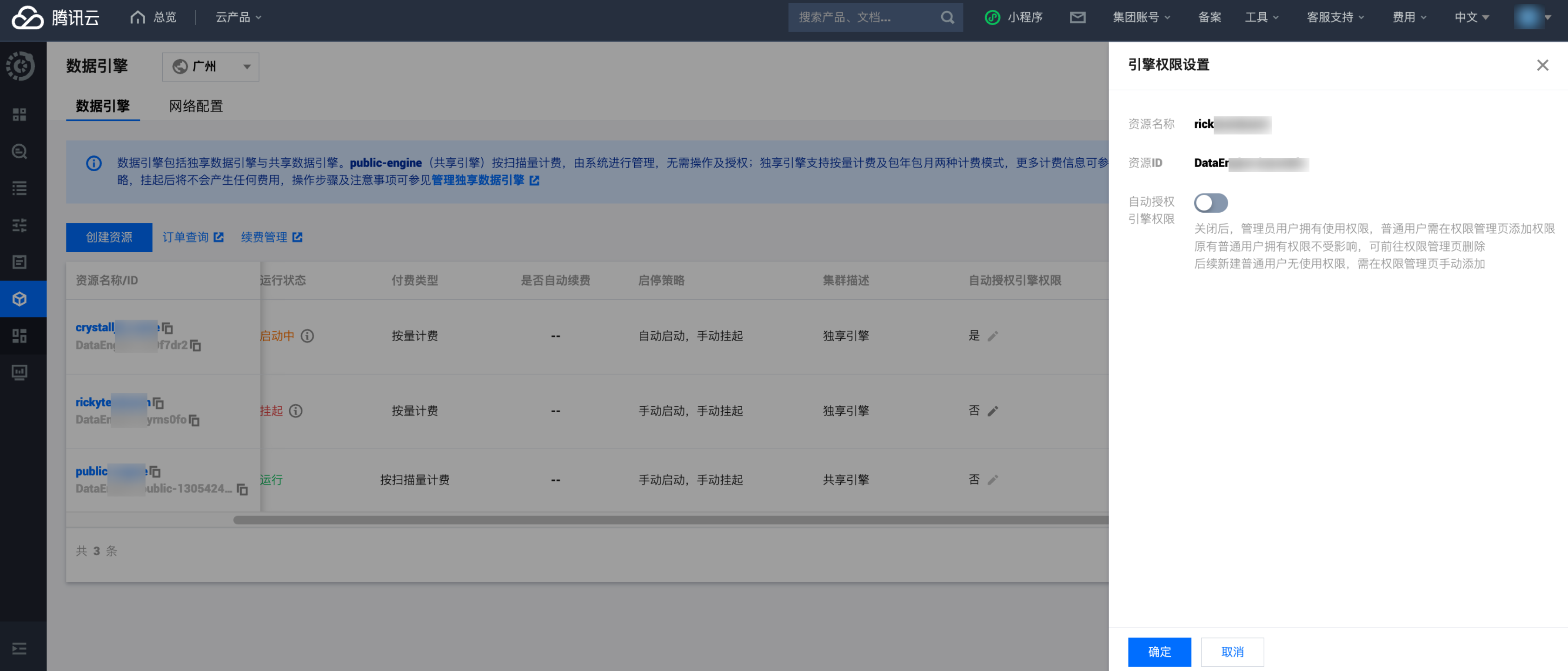 入口二:进入 引擎管理 页面,单击编辑授权引擎权限。 设置引擎权限后,单击确定。