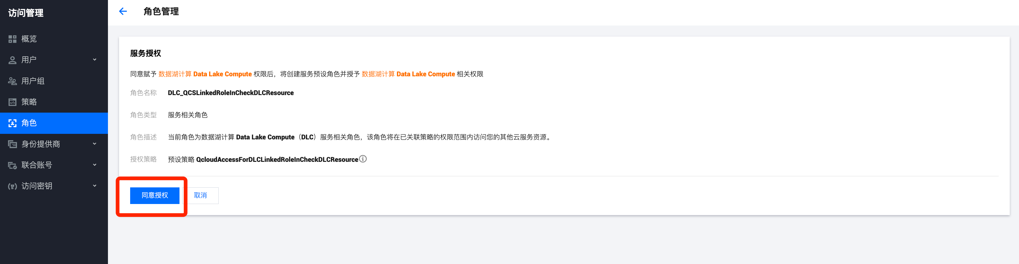 4. 在角色管理中,单击同意授权。