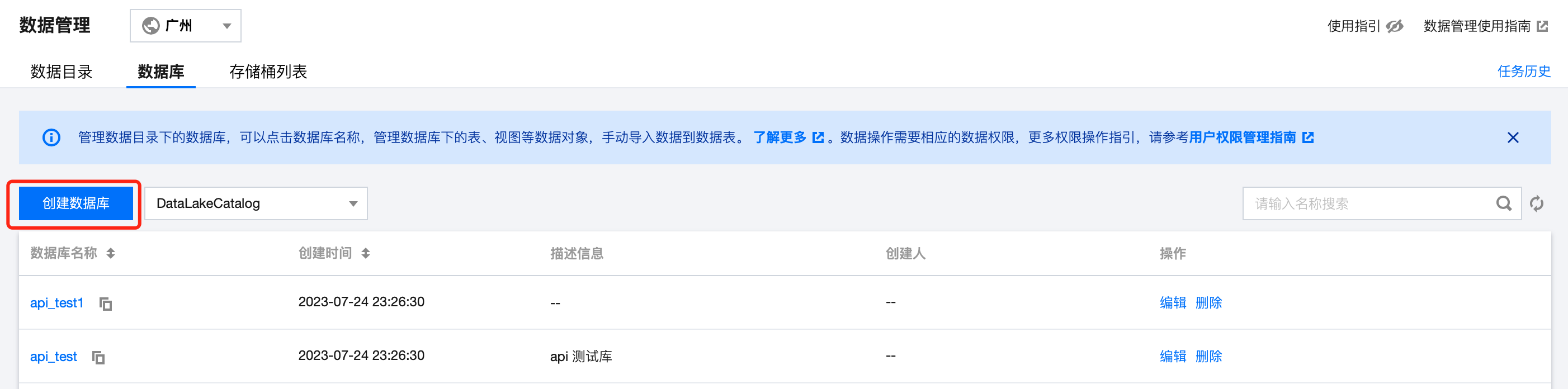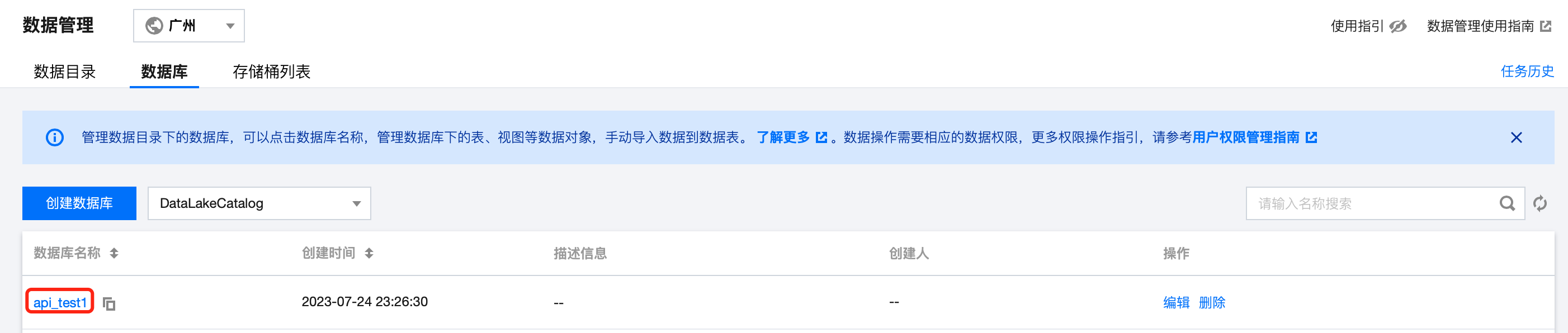 2. 进入数据管理 > 数据库,选择数据目录,单击数据库名称可进入数据库详情,可对数据库的数据表进行管理,详情操作指南可参见 数据表管理。 删除数据库