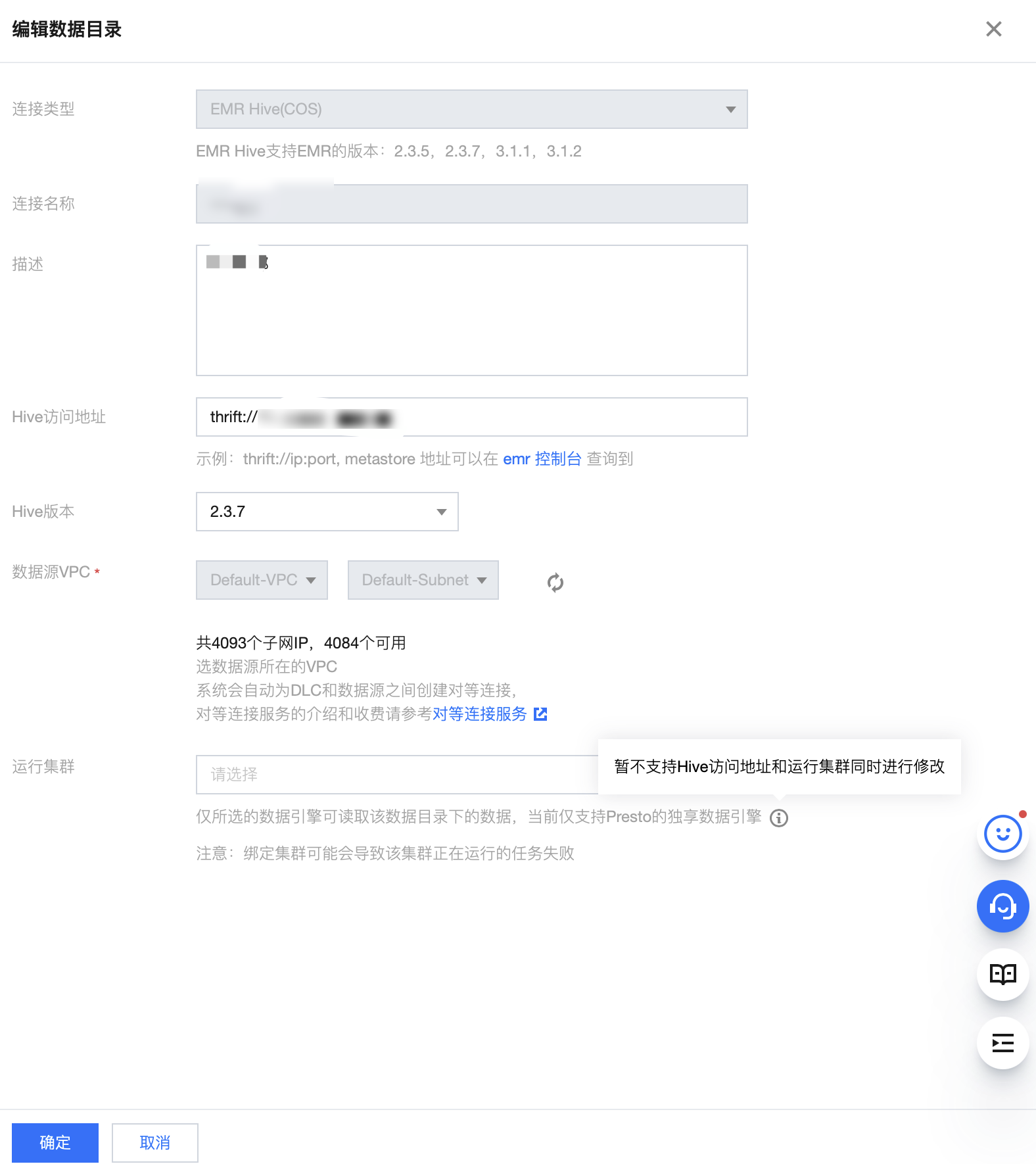 1. 单击数据目录列表 > 操作 > 编辑,支持修改数据目录的描述信息、网络配置信息、用户名、密码、运行集群等。