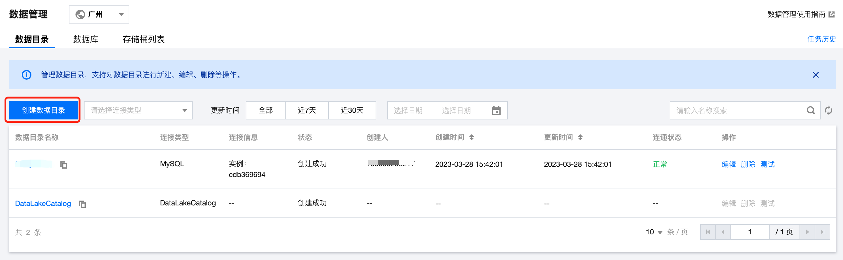 6. 在数据目录列表查看连接信息、状态、创建人等信息。