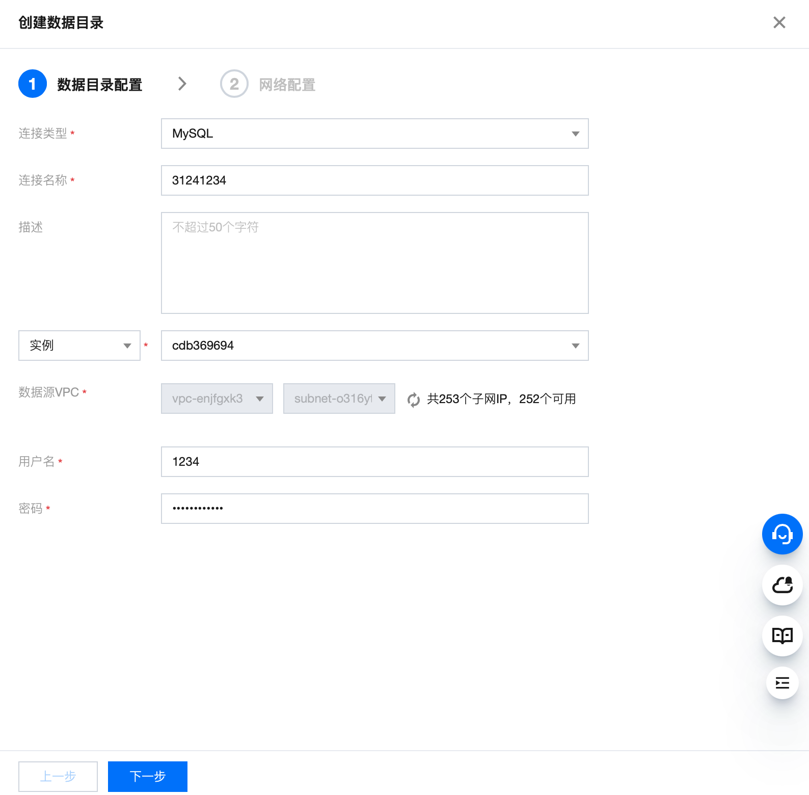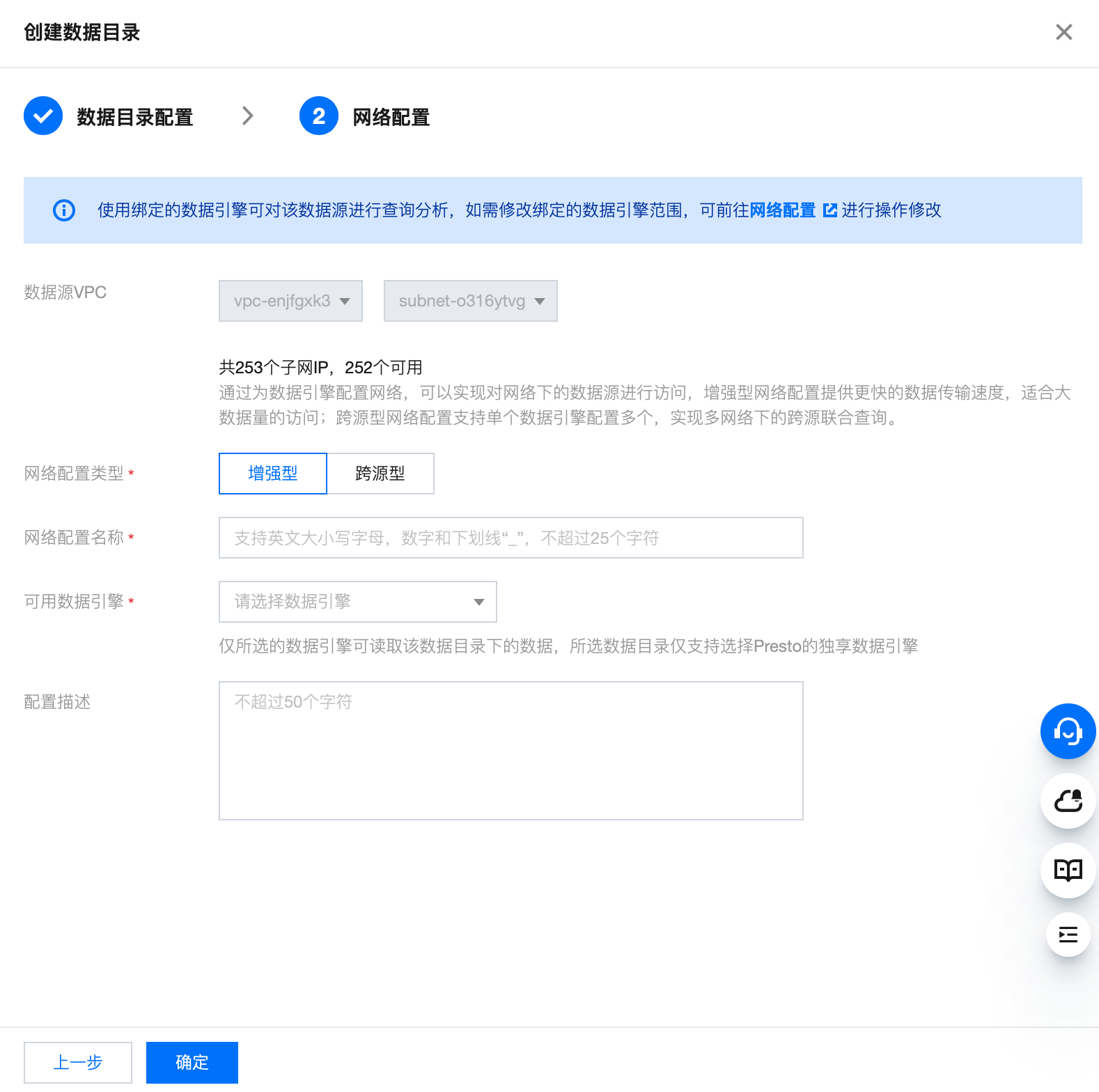 填写连接信息后,完成网络配置,打通引擎和外部数据源的网络。