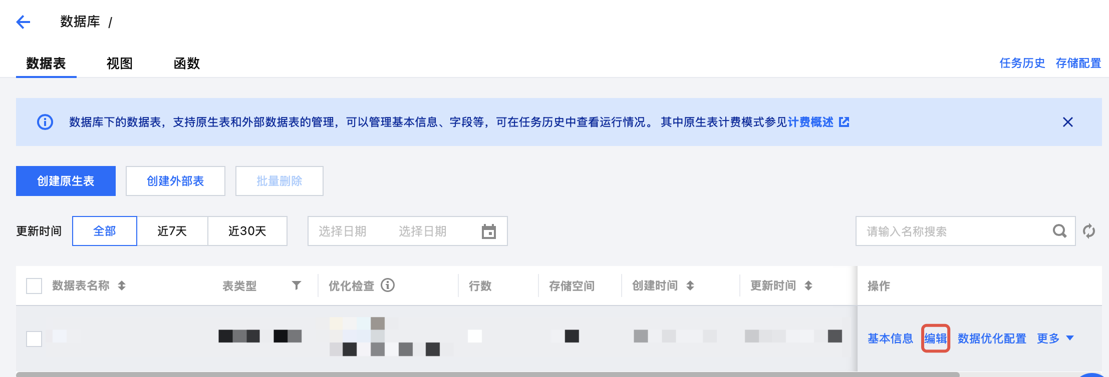 2. 通过左侧菜单进入元数据管理,进入数据库,单击数据表所在的数据库名称,进入数据库管理页面。 3. 单击创建原生表或创建外部表按钮,进入数据表配置页面。