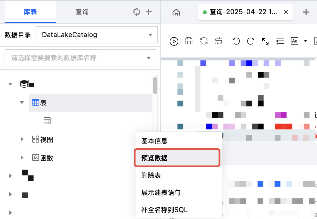 在数据表项目中,鼠标悬停数据表名称行,然后单击图标,在下拉菜单中单击预览数据,DLC 会自动生成预览10条数据的 SQL 语句,执行 SQL 语句查询数据表前10条数据。 数据预览功能默认展示前100条数据。